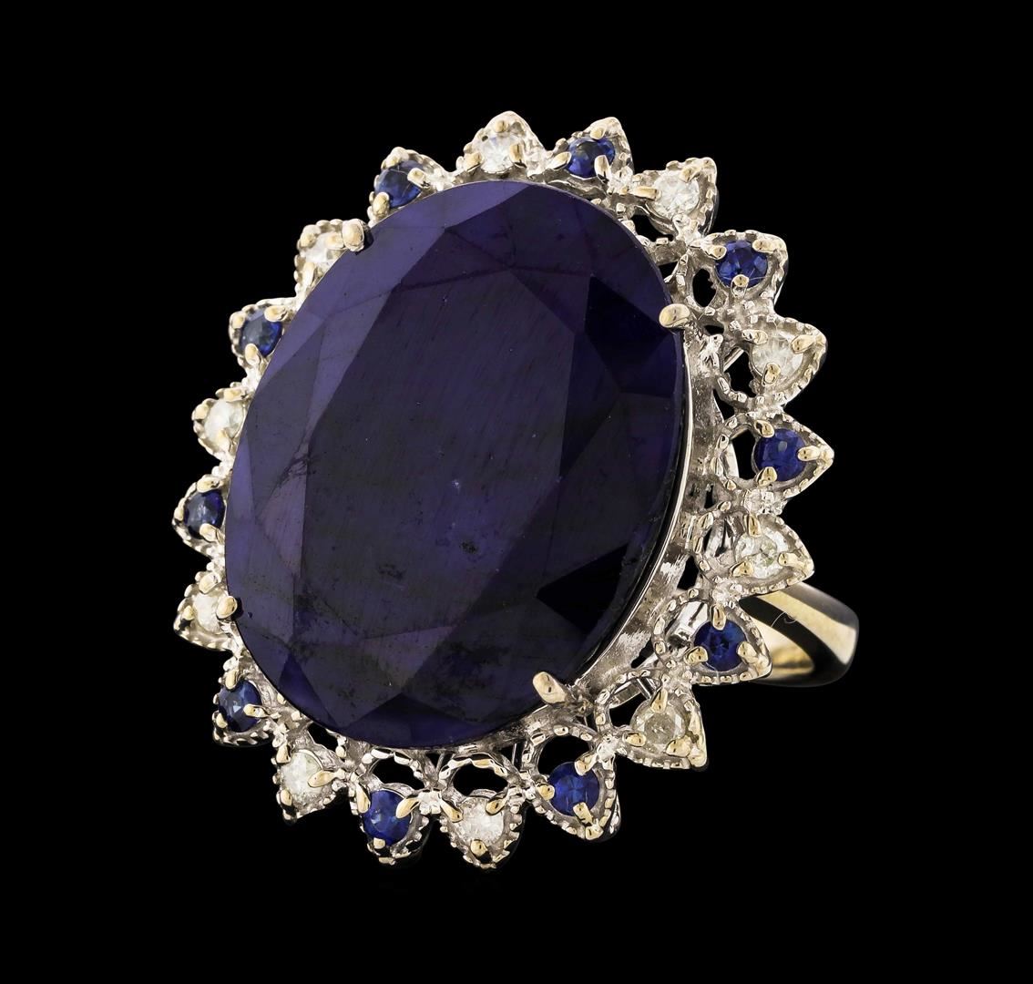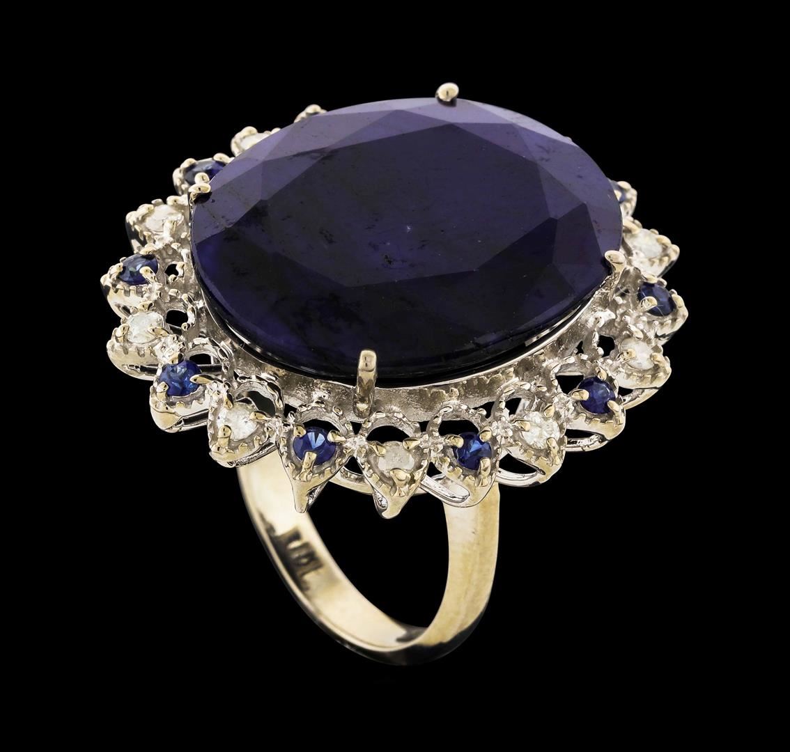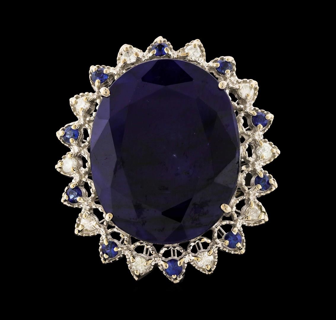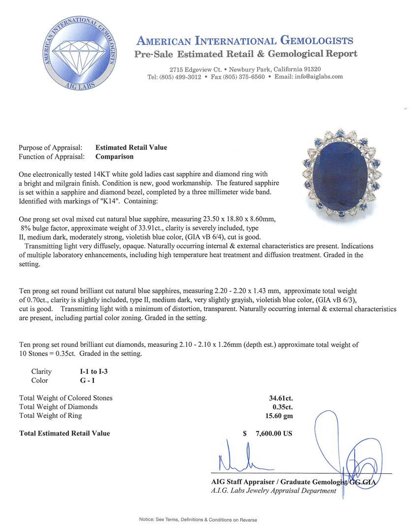 One electronically tested 14KT white gold ladies cast sapphire and diamond ring with a bright and milgrain finish. The featured sapphire is set within a sapphire and diamond bezel, completed by a three millimeter wide band. Identified with markings of "K14". Condition is new, good workmanship. Containing: One prong set oval mixed cut natural blue sapphire, measuring 23.50 x 18.80 x 8.60mm, 8%. bulge factor, approximate weight of 33.91ct., clarity is severely included, type II, medium dark, moderately strong, violetish blue color, (GIA vB 6/4), cut is good. Transmitting light very diffusely, opaque. Naturally occurring internal & external characteristics are present. Indications of multiple laboratory enhancements, including high temperature heat treatment and diffusion treatment. Graded in the setting. Ten prong set round brilliant cut natural blue sapphires, measuring 2.20 - 2.20 x 1.43 mm, approximate total weight of 0.70ct., clarity is slightly included, type II, medium dark, very slightly grayish, violetish blue color, (GIA vB 6/3), cut is good. Transmitting light with a minimum of distortion, transparent. Naturally occurring internal & external characteristics are present, including partial color zoning. Graded in the setting. Ten prong set round brilliant cut diamonds, measuring 2.10 - 2.10 x 1.26mm (depth est.) approximate total weight of 10 Stones = 0.35ct. Graded in the setting. Clarity: I-1 to I-3. Color: G - I. Total Weight of Colored Stones 34.61ct. Total Weight of Diamonds 0.35ct. Total Weight of Ring 15.60gm. AIG Appraised at $7,600.00.