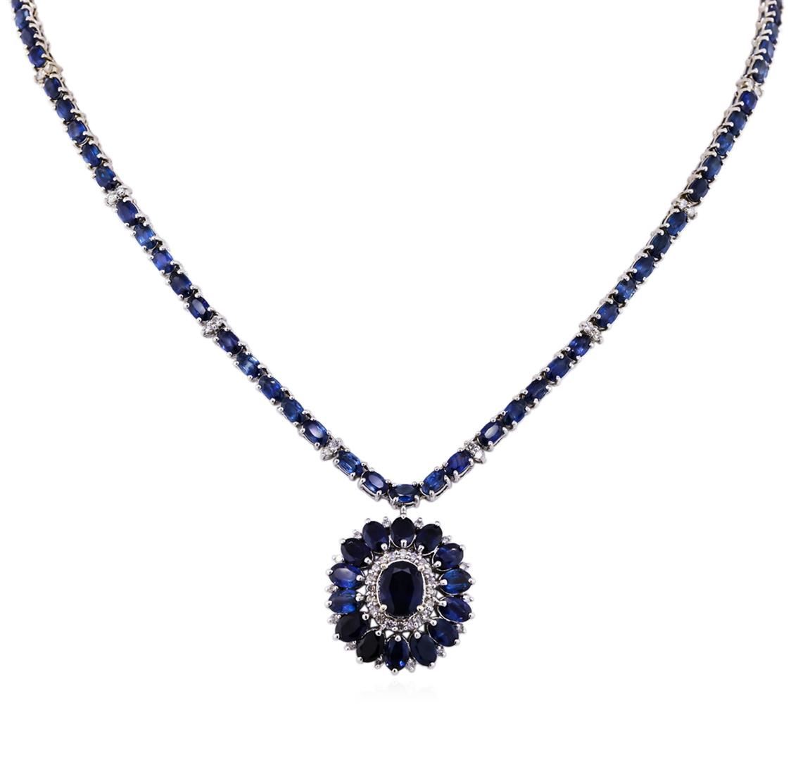 One electronically tested 14KT white gold ladies cast & assembled sapphire and diamond necklace with a bright polish finish. Seventeen and one-half inch length necklace features a sapphire and diamond floret pendant supported by a flexible sapphire and diamond duo ribbon, terminating in a concealed clasp with safety. Identified with markings of "K14". Condition is new, good workmanship. Containing: One prong set oval mixed cut natural blue sapphire, measuring 9.10 x 7.10 x 4.85mm, 15%. bulge factor, approximate weight of 3.16ct., clarity is moderately included, type II, dark, very slightly grayish, violetish blue color, (GIA vB 7/3), cut is good. Transmitting light somewhat diffusely, transparent to translucent. Naturally occurringinternal & external characteristics are present. Graded in the setting.Eighty-nine prong set oval mixed cut natural blue sapphires approximate. Total Weight of 32.87ct., clarity is moderately included, type II, dark, very slightly grayish, violetish blue color, (GIA vB 7/3), cut is good. Transmitting light somewhat diffusely, transparent to translucent. Naturally occurring internal & external characteristics are present, including partial color zoning. Color grade is an average for the group. Graded in the setting.Sixty-Four prong set round brilliant cut diamonds, measuring 1.90 - 1.80 x 1.11mm (depth est.) approximate. Total Weight of 64 Stones = 1.64ct. Graded in the setting. Clarity: I-1 to I-2. Color: H - J. Total Weight of Colored Stones 36.03ct. Total Weight of Diamonds 1.64ct. AIG Appraised at $19,055.00.
