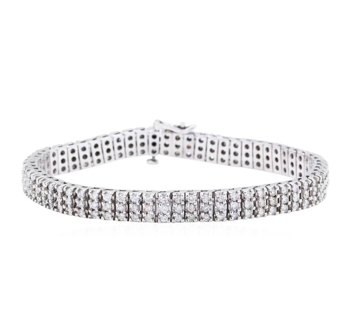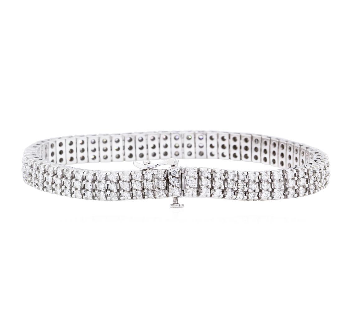 One electronically tested 14KT white gold lady's combination cast & assembled fashion three row tennis bracelet with a tongue clasp with foldover safety with a bright polish finish. The featured lady's bracelet measures approximately seven inches in length. Identified with markings of '14K'. Condition is new, good workmanship. Containing: One Hundred Eighty prong set round brilliant cut diamonds, measuring 1.80 - 1.75 x 1.10mm (depth est.) approximate total weight of 180 Stones = 4.00ct. Graded in the setting. Color G - H Clarity I-1 to I-2 Cut Good. Total Weight of Diamonds 4.00ct.. Total Weight of Bracelet 27.70gm. GAS Appraised.
