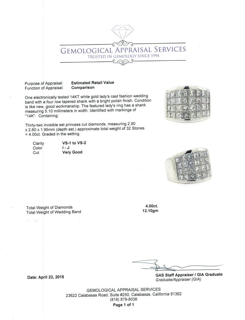 One electronically tested 14KT white gold Ladies cast fashion wedding band with a four row tapered shank with a bright polish finish. The featured Ladies ring has a shank measuring 5.10 millimeters in width. Identified with markings of '14K'. Condition is like new, good workmanship. Containing: Thirty-Two invisible set princess cut diamonds, measuring 2.90 x 2.60 x 1.95mm (depth est.) approximate total weight of 32 Stones = 4.00ct. Graded in the setting. Color I - J Clarity VS-1 to VS-2 Cut Very Good. Total Weight of Diamonds 4.00ct.. Total Weight of Wedding Band 12.10gm. GAS Appraised.