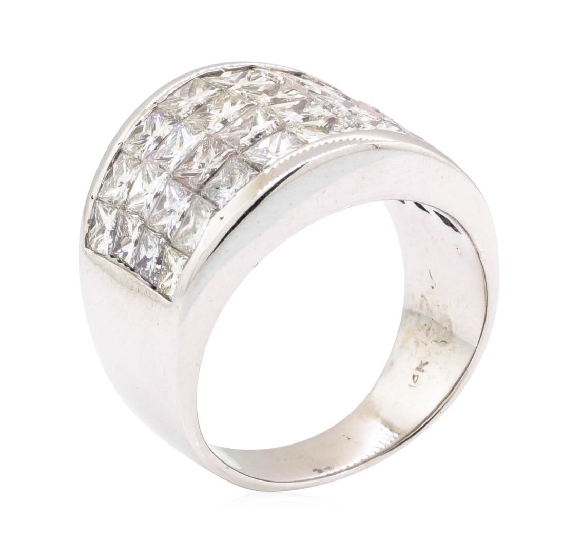 One electronically tested 14KT white gold Ladies cast fashion wedding band with a four row tapered shank with a bright polish finish. The featured Ladies ring has a shank measuring 5.10 millimeters in width. Identified with markings of '14K'. Condition is like new, good workmanship. Containing: Thirty-Two invisible set princess cut diamonds, measuring 2.90 x 2.60 x 1.95mm (depth est.) approximate total weight of 32 Stones = 4.00ct. Graded in the setting. Color I - J Clarity VS-1 to VS-2 Cut Very Good. Total Weight of Diamonds 4.00ct.. Total Weight of Wedding Band 12.10gm. GAS Appraised.