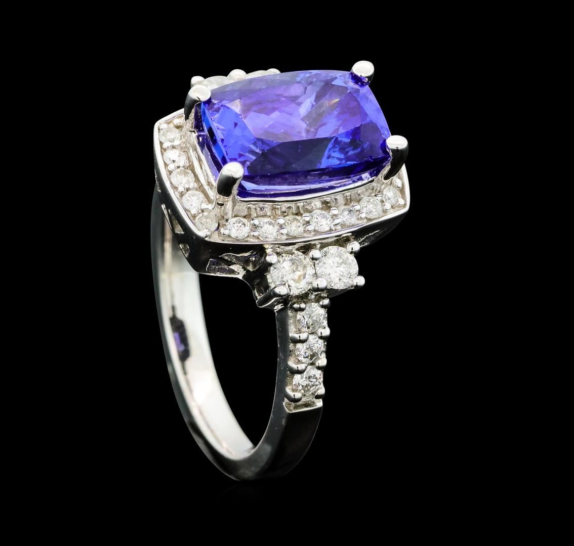 One electronically tested 14KT white gold ladies cast tanzanite and diamond ring with a bright polish finish. The featured tanzanite is set within a diamond bezel supported by a lattice under gallery and stylized diamond set shoulders, completed by a two millimeter wide band. Trademark is Orianne. Identified with markings of "14K". Condition is new, good workmanship. Containing: One prong set rectangular cushion mixed cut natural tanzanite, measuring 10.00 x 7.00 x 6.80mm, 5%. bulge factor, approximate weight of 4.00ct., clarity is eye clean, type I, medium dark, strong, violetish blue color, (GIA vB 6/5), cut is good. Transmitting light with no distortion, transparent. Graded in the setting.Tanzanite is a very rare gemstone that is only found in the country of Tanzania. Originally discovered in 1967. Tiffany & Company, named the stone Tanzanite. It is found in the Usumburu Mountains that border the Umba Valley of northern Tanzania. Tanzanite occurs in gray, brown, violet, blue, reddish-purple, & green. The gem is interesting because of its exceptional pleochroism. Rotated in different directions a tanzanite will exhibit multiple changes of color. Tanzanite has a low tolerance to ultrasonic cleaning, and should not be cleaned using this method.Thirty-Two prong set round brilliant cut diamonds approximate total weight of 32 Stones = 0.62ct. Graded in the setting. Clarity: SI-2 to I-2. Color: G - I. Total Weight of Colored Stones 4.00ct. Total Weight of Diamonds 0.62ct. Total Weight of Ring 7.07gm. AIG Appraised.