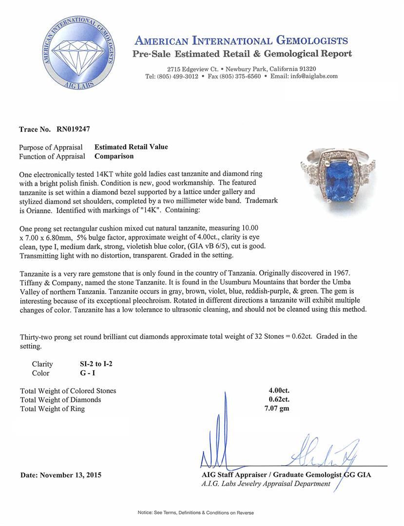 One electronically tested 14KT white gold ladies cast tanzanite and diamond ring with a bright polish finish. The featured tanzanite is set within a diamond bezel supported by a lattice under gallery and stylized diamond set shoulders, completed by a two millimeter wide band. Trademark is Orianne. Identified with markings of "14K". Condition is new, good workmanship. Containing: One prong set rectangular cushion mixed cut natural tanzanite, measuring 10.00 x 7.00 x 6.80mm, 5%. bulge factor, approximate weight of 4.00ct., clarity is eye clean, type I, medium dark, strong, violetish blue color, (GIA vB 6/5), cut is good. Transmitting light with no distortion, transparent. Graded in the setting.Tanzanite is a very rare gemstone that is only found in the country of Tanzania. Originally discovered in 1967. Tiffany & Company, named the stone Tanzanite. It is found in the Usumburu Mountains that border the Umba Valley of northern Tanzania. Tanzanite occurs in gray, brown, violet, blue, reddish-purple, & green. The gem is interesting because of its exceptional pleochroism. Rotated in different directions a tanzanite will exhibit multiple changes of color. Tanzanite has a low tolerance to ultrasonic cleaning, and should not be cleaned using this method.Thirty-Two prong set round brilliant cut diamonds approximate total weight of 32 Stones = 0.62ct. Graded in the setting. Clarity: SI-2 to I-2. Color: G - I. Total Weight of Colored Stones 4.00ct. Total Weight of Diamonds 0.62ct. Total Weight of Ring 7.07gm. AIG Appraised.