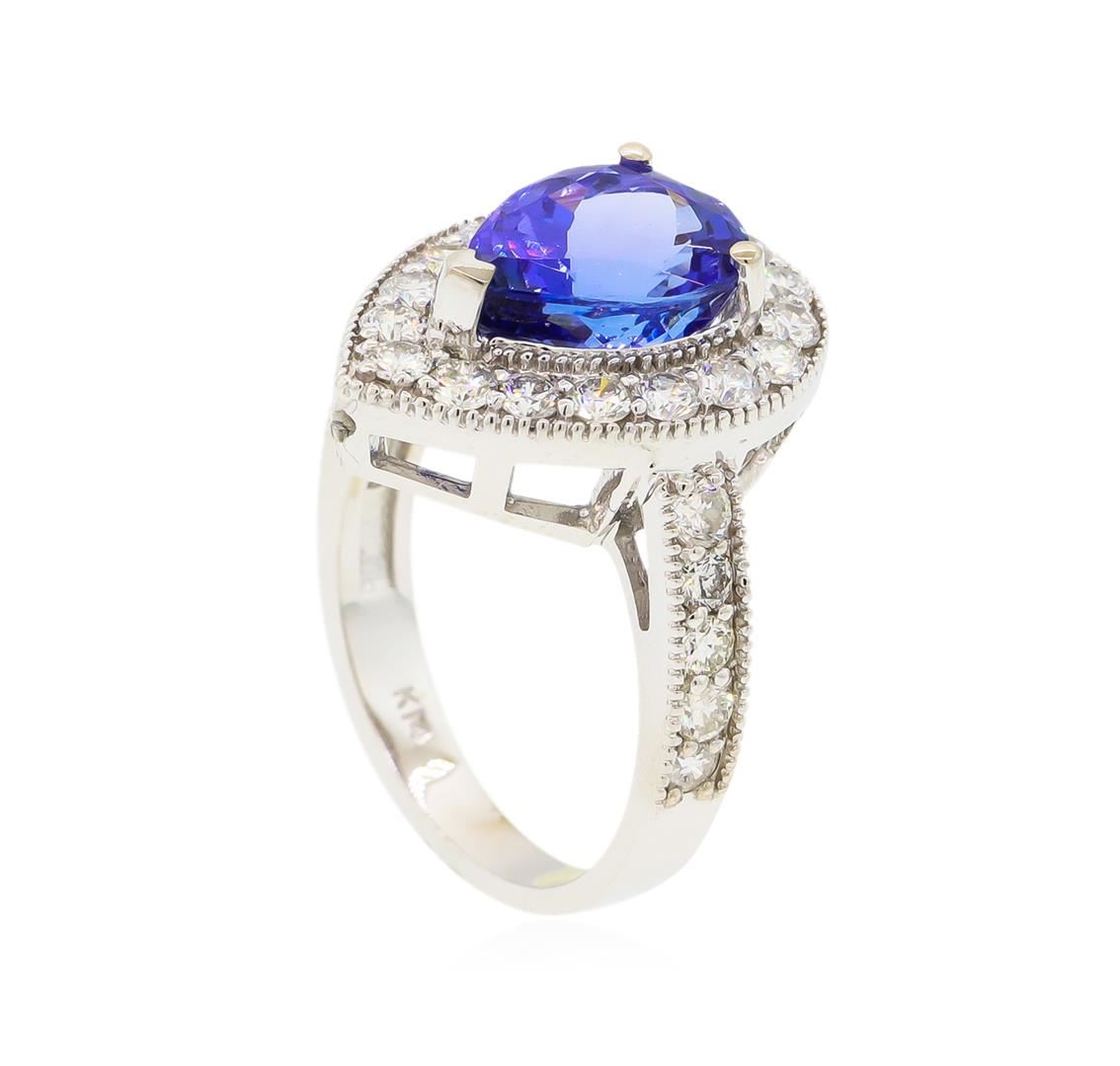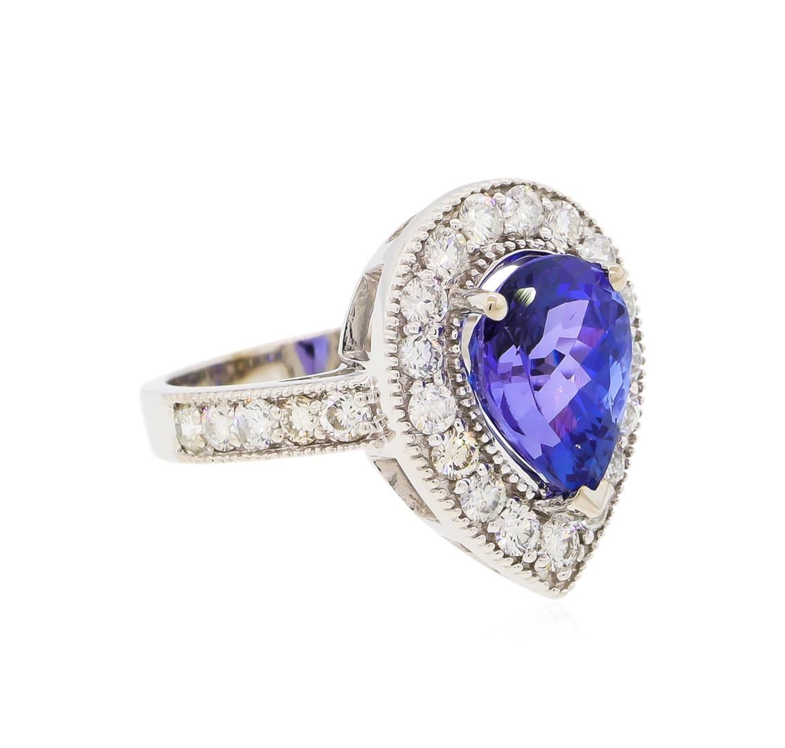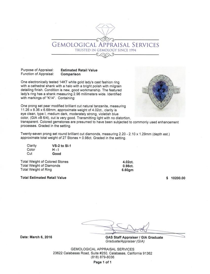 One electronically tested 14KT white gold lady's cast fashion ring with a cathedral shank with a halo with a bright polish with milgrain detailing finish. The featured lady's ring has a shank measuring 2.96 millimeters wide. Identified with markings of "K14". Condition is new, good workmanship. Containing: One prong set pear modified brilliant cut natural tanzanite, measuring 11.26 x 8.36 x 6.68mm, approximate weight of 4.02ct., clarity is eye clean, type I, medium dark, moderately strong, violetish blue color, (GIA vB 6/4), cut is very good. Transmitting light with no distortion, transparent. Colored gemstones are presumed to have been subjected to commonly used enhancement processes. Graded in the setting. Twenty-Seven prong set round brilliant cut diamonds, measuring 2.20 - 2.10 x 1.29mm (depth est.) approximate total weight of 27 Stones = 0.98ct. Graded in the setting. Clarity: VS-2 to SI-1. Color: H - I, Cut Good. Total Weight of Colored Stones 4.02ct. Total Weight of Diamonds 0.98ct. Total Weight of Ring 6.60gm. GAS Appraised at $10,200.00.