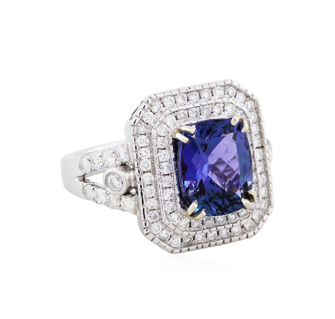One electronically tested 14KT white gold ladies cast tanzanite and diamond ring. The featured tanzanite is set within a tiered diamond lattice gallery, supported by diamond set split shoulders, completed by a three millimeter wide band. Bright polish finish with milgrain detailing throughout. Identified with markings of "14K RT". Condition is new, good workmanship. Containing: One prong set rectangular cushion mixed cut natural tanzanite, measuring 10.60 x 8.80 x 5.50mm, approximate weight of 4.05ct., clarity is eye clean, type I, medium, very slightly grayish, blue color, (GIA B 5/3) to medium, very slightly grayish, violet, (GIA V 5/3), cut is good. Transmitting light with no distortion, transparent. The stone displays 40%. extinction. Graded in the setting.Tanzanite is a very rare gemstone that is only found in the country of Tanzania. Originally discovered in 1967. Tiffany & Company, named the stone Tanzanite. It is found in the Usumburu Mountains that border the Umba Valley of northern Tanzania. Tanzanite occurs in gray, brown, violet, blue, reddish-purple, & green. The gem is interesting because of its exceptional pleochroism. Rotated in different directions a tanzanite will exhibit multiple changes of color. Tanzanite has a low tolerance to ultrasonic cleaning, and should not be cleaned using this method.Eighty-Two prong, bead & bezel set round brilliant cut diamonds, measuring 2.30 - 1.30 x 1.08mm (depth est.) approximate. Total Weight of 82 Stones = 1.15ct. Graded in the setting. Clarity: SI-2 to I-2. Color: F - H. Total Weight of Colored Stones 4.05ct. Total Weight of Diamonds 1.15ct. AIG Appraised at $13,425.00.