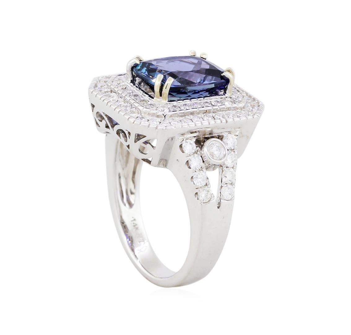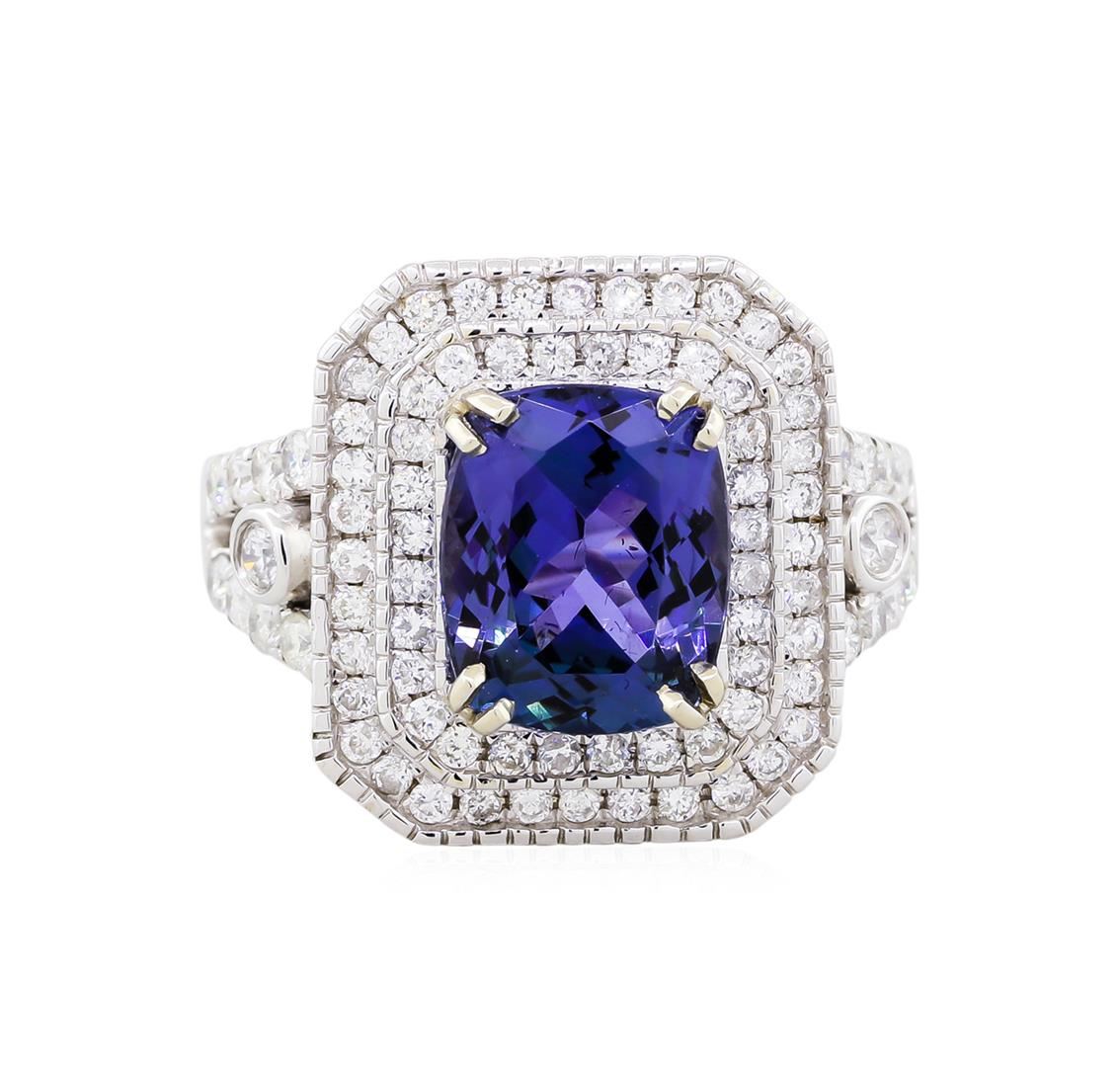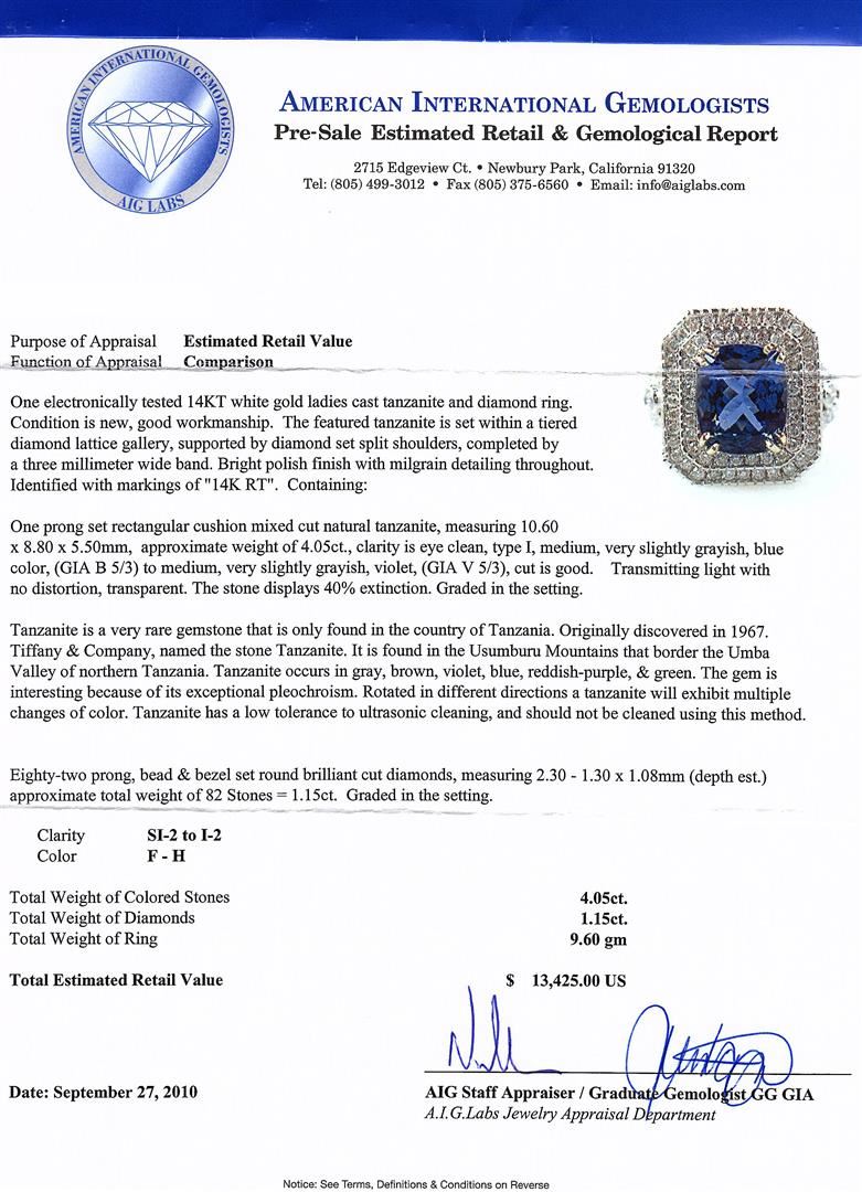 One electronically tested 14KT white gold ladies cast tanzanite and diamond ring. The featured tanzanite is set within a tiered diamond lattice gallery, supported by diamond set split shoulders, completed by a three millimeter wide band. Bright polish finish with milgrain detailing throughout. Identified with markings of "14K RT". Condition is new, good workmanship. Containing: One prong set rectangular cushion mixed cut natural tanzanite, measuring 10.60 x 8.80 x 5.50mm, approximate weight of 4.05ct., clarity is eye clean, type I, medium, very slightly grayish, blue color, (GIA B 5/3) to medium, very slightly grayish, violet, (GIA V 5/3), cut is good. Transmitting light with no distortion, transparent. The stone displays 40%. extinction. Graded in the setting.Tanzanite is a very rare gemstone that is only found in the country of Tanzania. Originally discovered in 1967. Tiffany & Company, named the stone Tanzanite. It is found in the Usumburu Mountains that border the Umba Valley of northern Tanzania. Tanzanite occurs in gray, brown, violet, blue, reddish-purple, & green. The gem is interesting because of its exceptional pleochroism. Rotated in different directions a tanzanite will exhibit multiple changes of color. Tanzanite has a low tolerance to ultrasonic cleaning, and should not be cleaned using this method.Eighty-Two prong, bead & bezel set round brilliant cut diamonds, measuring 2.30 - 1.30 x 1.08mm (depth est.) approximate. Total Weight of 82 Stones = 1.15ct. Graded in the setting. Clarity: SI-2 to I-2. Color: F - H. Total Weight of Colored Stones 4.05ct. Total Weight of Diamonds 1.15ct. AIG Appraised at $13,425.00.