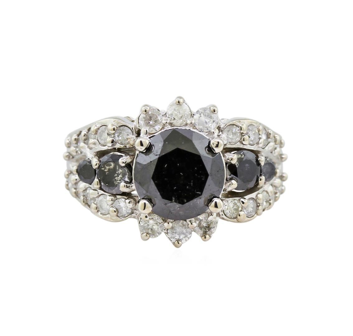 One electronically tested 14KT white gold ladies cast black and white diamond ring with a bright polish finish. The ring features a tapering black diamond ribbon set within mirroring white diamond ribbons, completed by a three millimeter wide band. Identified with markings of "K14". Condition is new, good workmanship. Containing: One prong set round brilliant cut diamond, measuring 8.10 - 8.00 x 6.20mm (depth est.), 15.00.%. GTCF approximate weight of 2.80ct. Indications of multiple laboratory enhancements. Graded in the setting. Clarity D‚class‚. Color: Fancy Black; Irradiated. Four prong set round brilliant cut diamonds (depth est.) approximate. Total Weight of 4 Stones = 0.51ct. Indications of multiple laboratory enhancements. Graded in the setting. Clarity D‚class‚. Color: Fancy Black; Irradiated. Twenty-Six prong set round brilliant cut diamonds, measuring 2.20 - 1.80 x 1.20mm (depth est.) approximate. Total Weight of 26 Stones = 0.74ct. Graded in the setting. Clarity: I-2 to I-3. Color: H - J. Total Weight of Diamonds 4.05ct. AIG Appraised at $5,335.00.