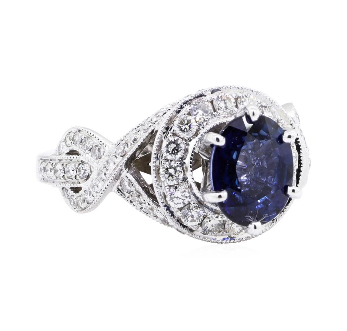 One electronically tested 14KT white gold lady's combination cast & assembled fashion ring with a crossover split shank with a halo with a bright polish with milgrain detailing finish. The featured lady's ring has a shank measuring 2.20 millimeters wide. Identified with markings of '14K'. Condition is new, good workmanship. Containing: One prong set oval modified mixed cut natural blue sapphire, measuring 8.95 x 7.12 x 4.63mm, (depth est.) approximate weight of 2.53ct., clarity is slightly included, medium, very slightly grayish, blue color, (GIA B 5/3), cut is good. Transmitting light with a minimum of distortion, transparent. Colored gemstones are presumed to have been subjected to commonly used enhancement processes. Graded in the setting. Sixteen prong set round brilliant cut diamonds, measuring 2.00 - 1.95 x 1.23mm (depth est.) approximate total weight of 16 Stones = 0.47ct. Graded in the setting. Color H - I Clarity SI-1 to SI-2 Cut Very Good One Hundred Thirty-Two prong set round brilliant cut diamonds, measuring 1.40 - 1.20 x 0.81mm (depth est.) approximate total weight of 132 Stones = 1.10ct. Graded in the setting. Color H - I Clarity VS-2 to SI-2 Cut Good. Total Weight of Colored Stones 2.53ct. Total Weight of Diamonds 1.57ct. Total Weight of Ring 7.30gm. GAS Appraised.