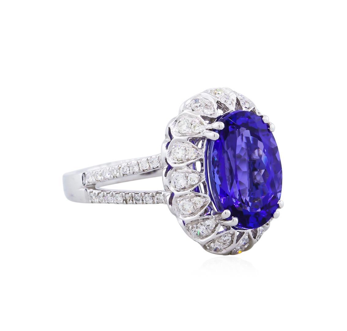 One gorgeous tanzanite and diamond ring set in 14KT white gold weighing 5.15 grams containing one oval shaped tanzanite center stone with a total weight of 4.11cts intricately framed by sixty-four round diamonds with a total weight of 0.43cts.