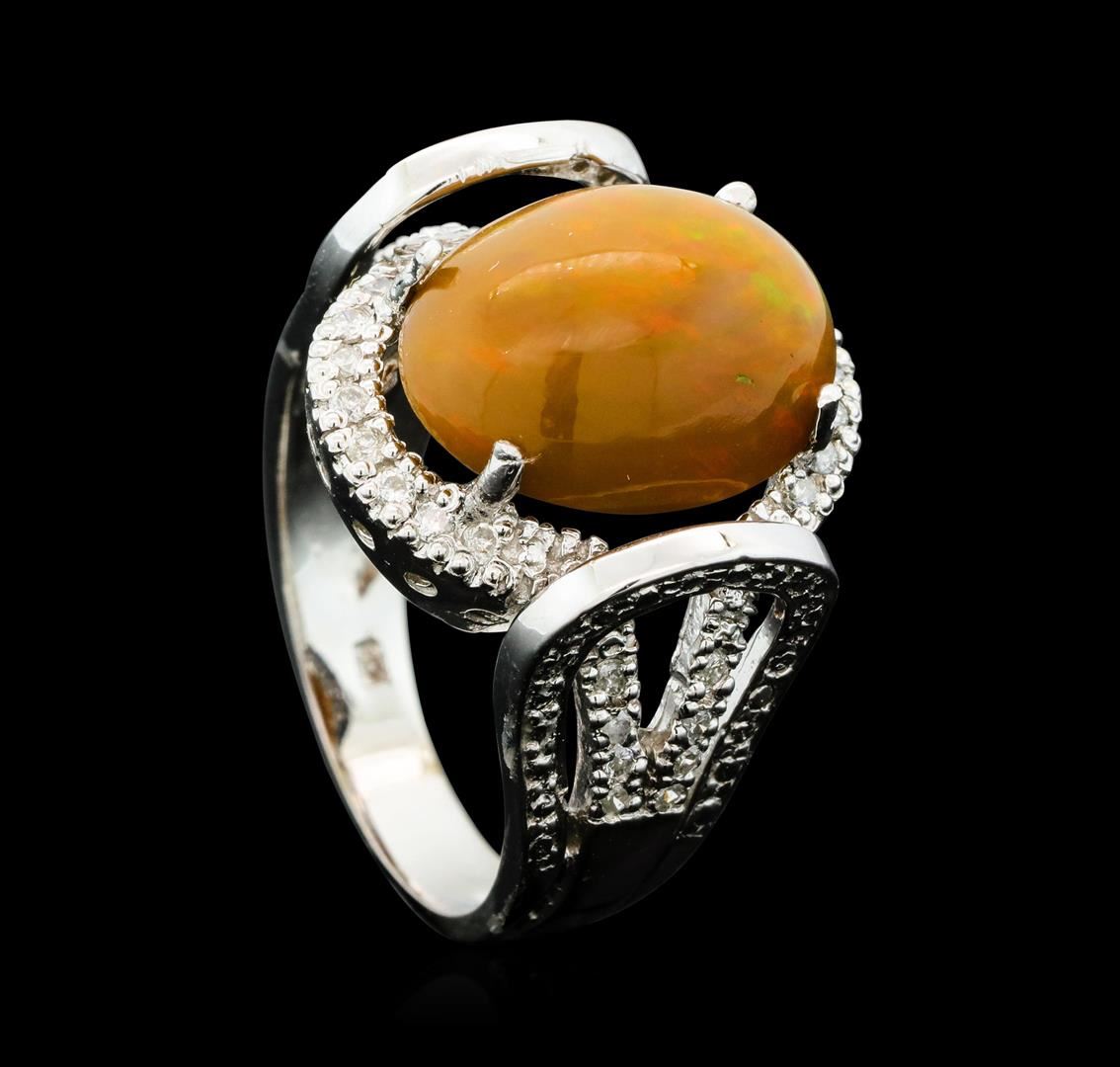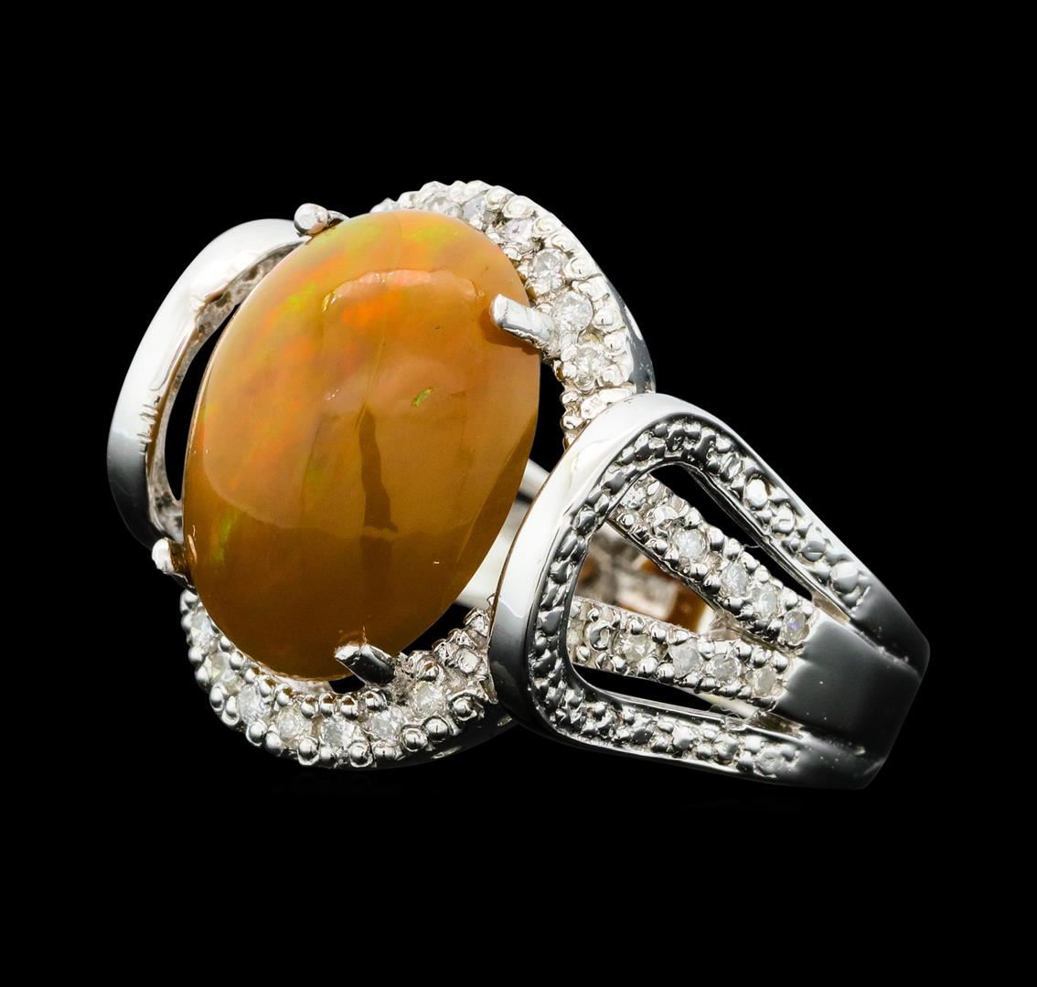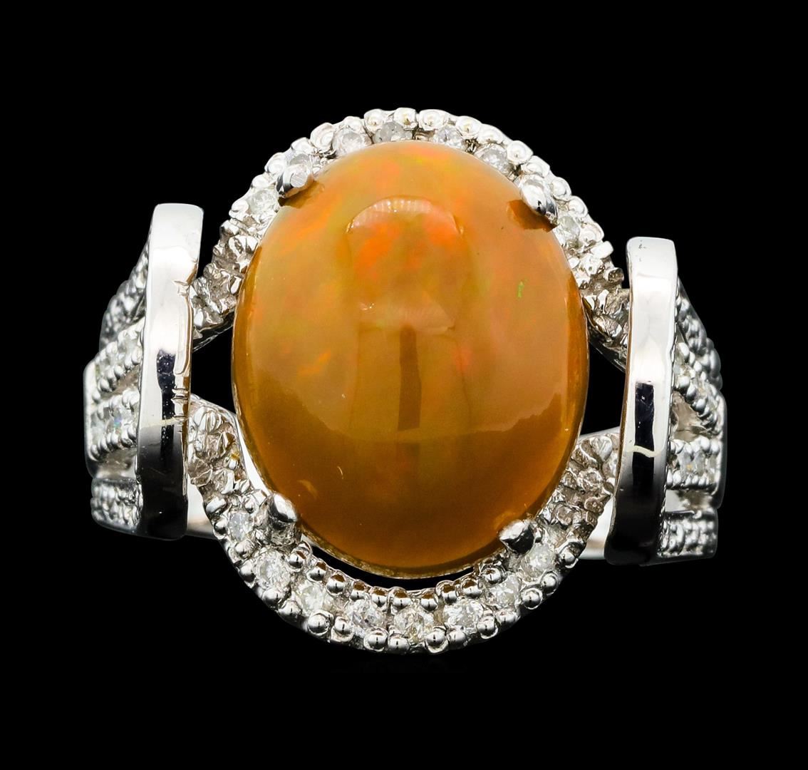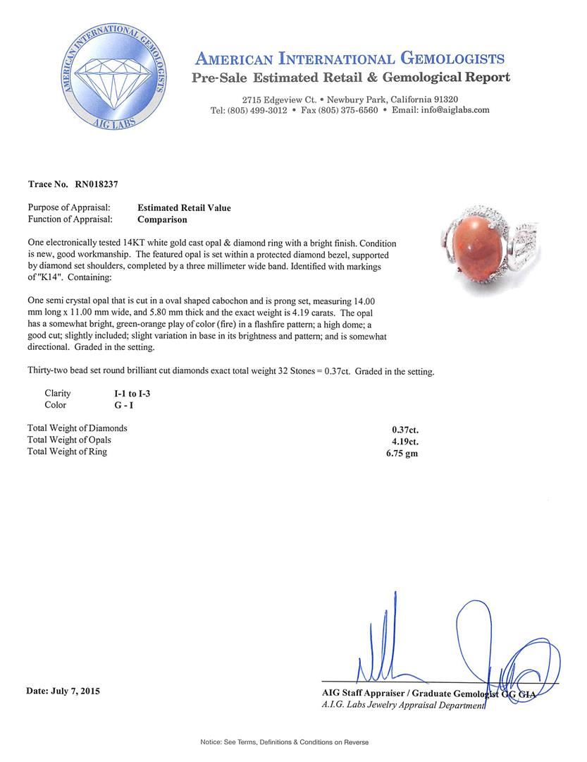 One electronically tested 14KT white gold cast opal & diamond ring with a bright finish. The featured opal is set within a protected diamond bezel, supported by diamond set shoulders, completed by a three millimeter wide band. Identified with markings of "K14". Condition is new, good workmanship. Containing: One semi crystal opal that is cut in a oval shaped cabochon and is prong set, measuring 14.00 mm long x 11.00 mm wide, and 5.80 mm thick and the exact weight is 4.19 carats. The opal has a somewhat bright, green-orange play of color (fire) in a flashfire pattern; a high dome; a good cut; slightly included; slight variation in base in its brightness and pattern; and is somewhat directional. Graded in the setting. Thirty-Two bead set round brilliant cut diamonds exact total weight 32 Stones = 0.37ct. Graded in the setting. Clarity: I-1 to I-3. Color: G - I. Total Weight of Diamonds 0.37ct. Total Weight of Opals 4.19ct. Total Weight of Ring 6.75gm. AIG Appraised.