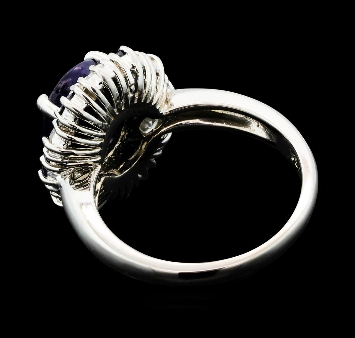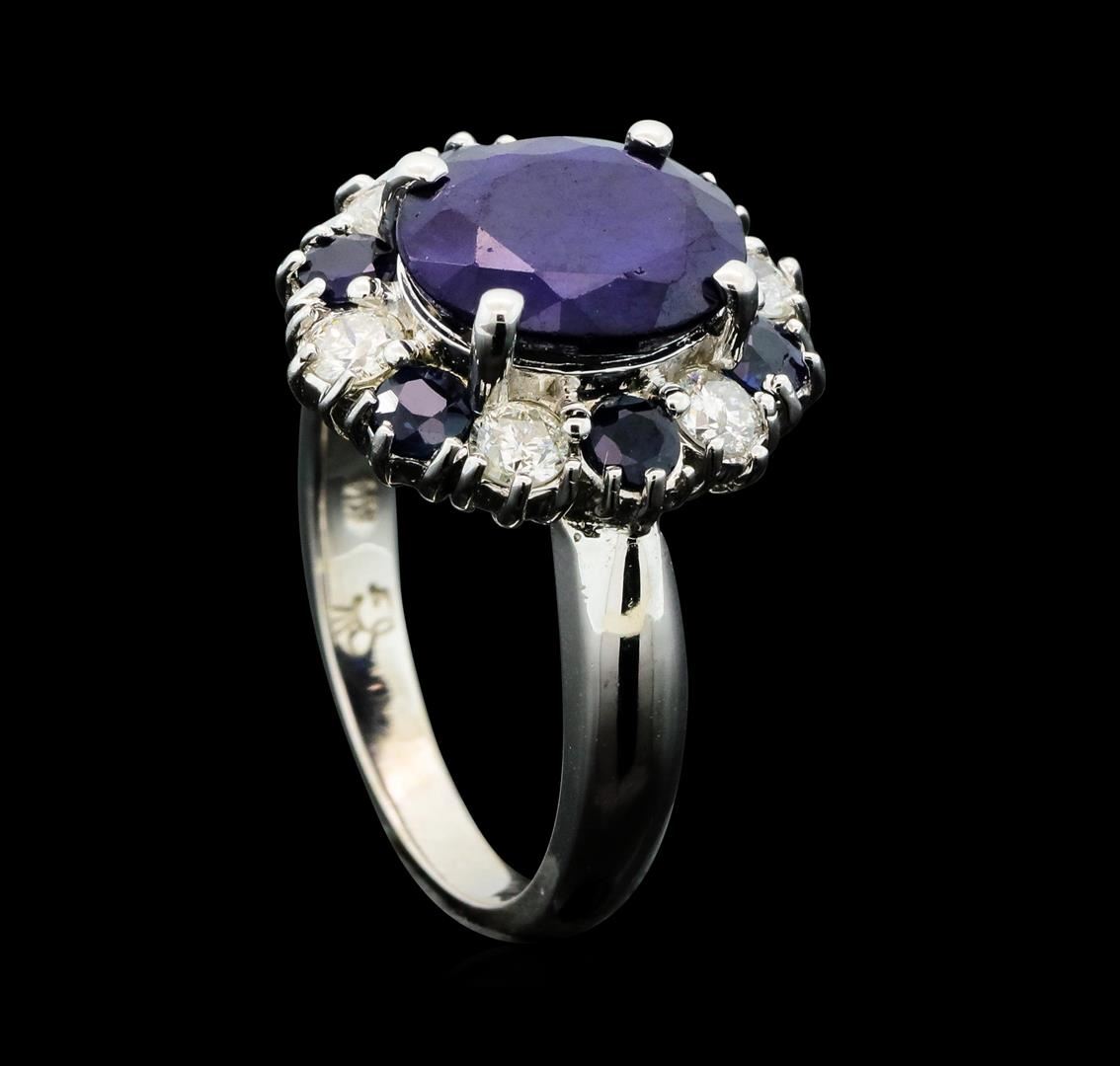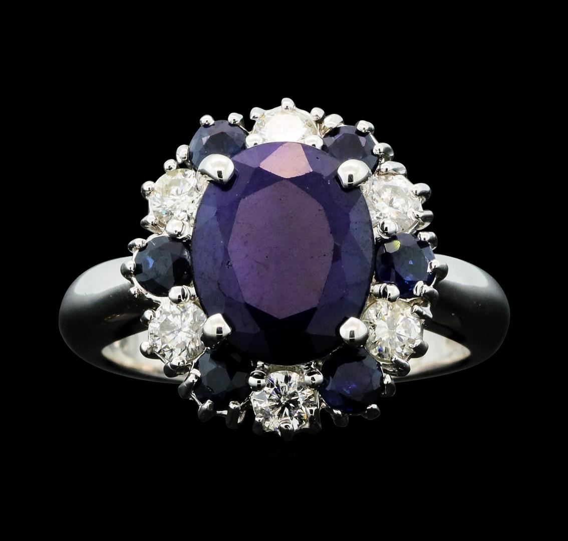 One electronically tested 14KT white gold ladies cast sapphire and diamond ring with a bright polish finish. The featured sapphire is set within a sapphire and diamond floret bezel, completed by a two millimeter wide band. Identified with markings of "K14". Condition is new, good workmanship. Containing: One prong set oval mixed cut natural blue sapphire, measuring 9.95 x 8.00 x 5.10mm, approximate weight of 3.53ct., type II, medium dark, moderately strong, blue color, (GIA B 6/4), cut is good. Transmitting light very diffusely, opaque. Naturally occurring internal & external characteristics are present. Indications of multiple laboratoryenhancements, including high temperature diffusion treatment. Graded in the setting.Six prong set round mixed cut natural blue sapphires, measuring 2.80 - 2.80 x 1.82 mm, approximate total weight of 0.70ct., clarity is moderately included, type II, dark, moderately strong, blue color, (GIA B 7/4), cut is good. Transmitting light somewhat diffusely, transparent to translucent. Naturally occurring internal & external characteristics are present. Color grade is an average for the group. Indications of multiple laboratory enhancements, including high temperature diffusion treatment. Graded in the setting.Six prong set round brilliant cut diamonds approximate total weight of 6 Stones = 0.47ct. Graded in the setting. Clarity: I-1 to I-2. Color: F - H. Total Weight of Colored Stones 4.23ct. Total Weight of Diamonds 0.47ct. Total Weight of Ring 5.28gm. AIG Appraised.