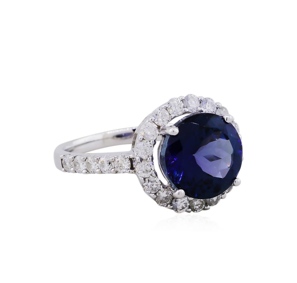 One electronically tested 14KT white gold ladies cast tanzanite and diamond ring with a bright polish finish. The featured tanzanite is set within a diamond bezel supported by diamond set shoulders, completed by a one and one-half millimeter wide band. Trademark is Orianne. Identified with markings of "14K". Condition is new, good workmanship. Containing: One prong set round brilliant cut natural tanzanite, measuring 9.48 - 9.45 x 6.45 mm, 10% bulge factor, approximate weight of4.26ct., clarity is eye clean, type I, dark, very slightly grayish, violetish blue color, (GIA vB 7/3), cut is good. Natural Tanzanite, color enhanced due to cobalt coating. The presence of the coating prevents determining the stone's actual depth of color. Transmitting light with no distortion, transparent. Grading in the setting. Tanzanite is a very rare gemstone that is only found in the country' of Tanzania. Originally discovered in 1967. Tiffany & Company, named the stone Tanzanite. It is found in the Usumburu Mountains that border the Umba Valley of northern Tanzania. Tanzanite occurs in gray, brown, violet, blue, reddish-purple, & green. The gem is interesting because of its exceptional pleochroism. Rotated in different directions a tanzanite will exhibit multiple changes of color. Twenty-Seven prong set round brilliant cut diamonds, measuring 2.10 - 2.00 x 1.23mm (depth est.) approximate total weight of 27 Stones -- 0.96ct. Graded in the setting. Clarity SI-2 to I-2, Color H-J. Total weight of Tanzanite is 4.26ct. Total Weight of Diamonds is .96cts. Total Weight of Ring is 4.00 grams. AIG Appraised at $4,970.00.