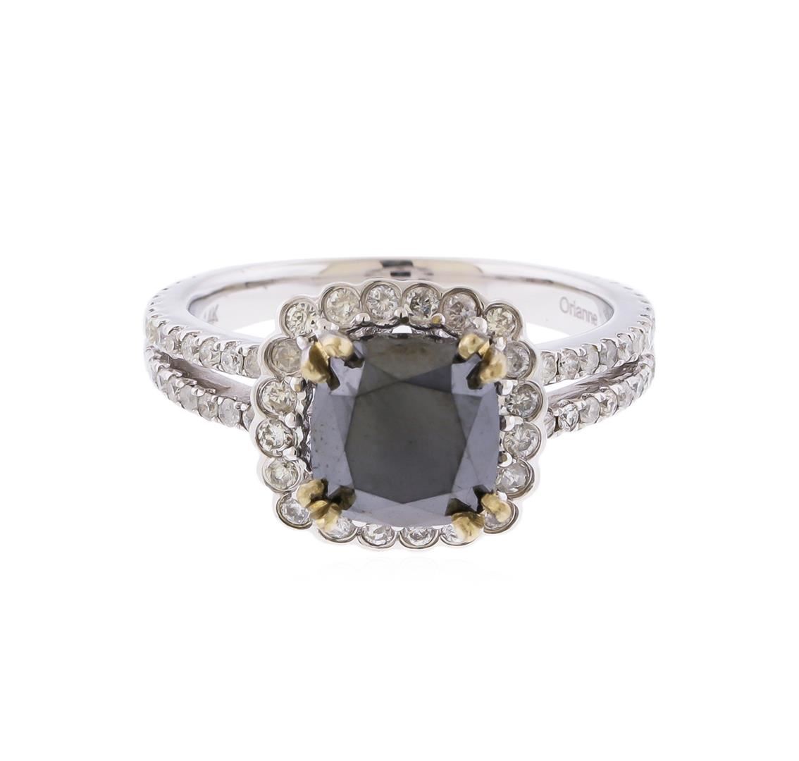 One electronically tested 14KT white gold ladies cast black and white diamond ring with a bright polish finish. The featured black diamond is set within a white diamond bezel supported by white diamond set split shoulders, completed by a two millimeter wide band. Trademark is Orianne. Identified with markings of "14K". Condition is new, good workmanship. Containing: One prong set cushion cut diamond, measuring 7.80 x 7.65 x 5.50mm (depth est.), 10.00.%. GTCF approximate weight of 3.46ct. Indications of multiple laboratory enhancements. The specific gravity of black diamond is 3.120 to 3.165. Diamond tester results are non-reactive. Graded in the setting. Clarity D‚class‚. Color: Fancy Black; Irradiated. Depth: 71.9%. Table: 65.3%. One Hundred Fourteen bezel and prong set round brilliant cut diamonds, measuring 1.60 - 1.10 x 0.81mm (depth est.) approximate total weight of 114 Stones = 0.81ct. The clairy grade reflects the entire range of clarityfor this group. Graded in the setting. Clarity: SI-2 to I-3. Color: H - J. Total Weight of Diamonds 4.27ct. AIG Appraised at $6,325.00.