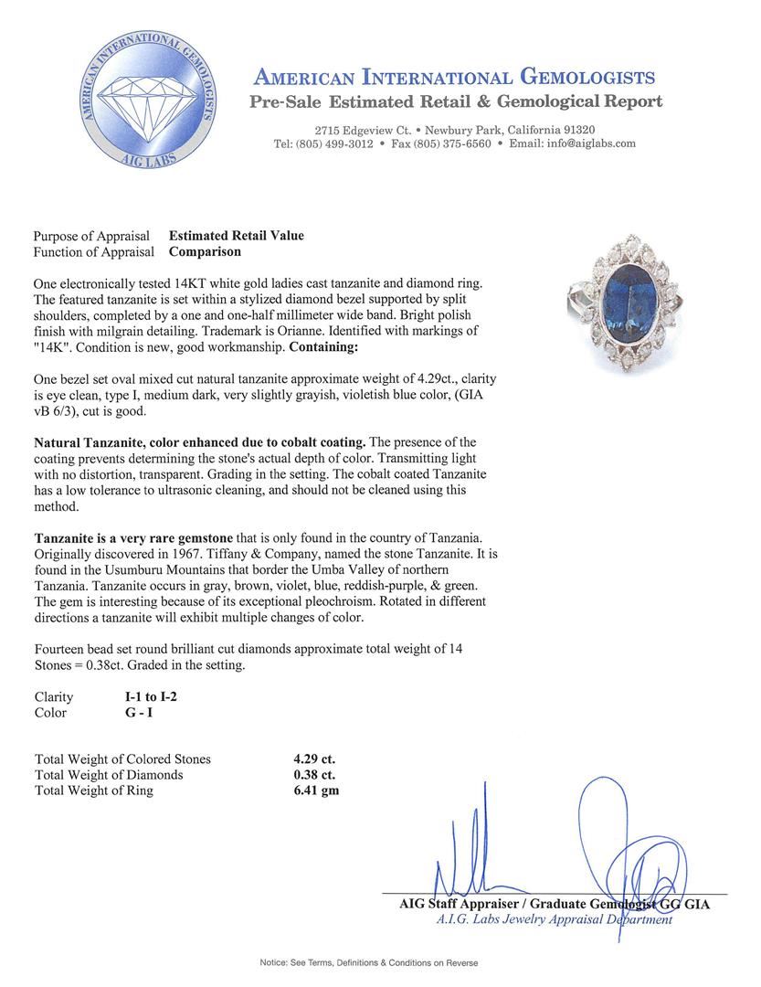 One electronically tested 14KT white gold ladies cast tanzanite and diamond ring. The featured tanzanite is set within a stylized diamond bezel supported by split shoulders, completed by a one and one-half millimeter wide band. Bright polish finish with milgrain detailing. Trademark is Orianne. Identified with markings of "14K". Condition is new, good workmanship. Containing: One bezel set oval mixed cut natural tanzanite approximate weight of 4.29ct., clarity is eye clean, type I, medium dark, very slightly grayish, violetish blue color, (GIA vB 6/3), cut is good. Natural Tanzanite, color enhanced due to cobalt coating. The presence of the coating prevents determining the stone's actual depth of color. Transmitting light with no distortion, transparent. Grading in the setting. The cobalt coated Tanzanite has a low tolerance to ultrasonic cleaning, and should not be cleaned using this method. Tanzanite is a very rare gemstone that is only found in the country of Tanzania. Originally discovered in 1967. Tiffany & Company, named the stone Tanzanite. It is found in the Usumburu Mountains that border the Umba Valley of northern Tanzania. Tanzanite occurs in gray, brown, violet, blue, reddish-purple, & green. The gem is interesting because of its exceptional pleochroism. Rotated in different directions a tanzanite will exhibit multiple changes of color. Fourteen bead set round brilliant cut diamonds approximate total weight of 14 Stones = 0.38ct. Graded in the setting. Clarity: I-1 to I-2. Color: G - I. Total Weight of Colored Stones 4.29ct. Total Weight of Diamonds 0.38ct. Total Weight of Ring 6.41gm. AIG Appraised.