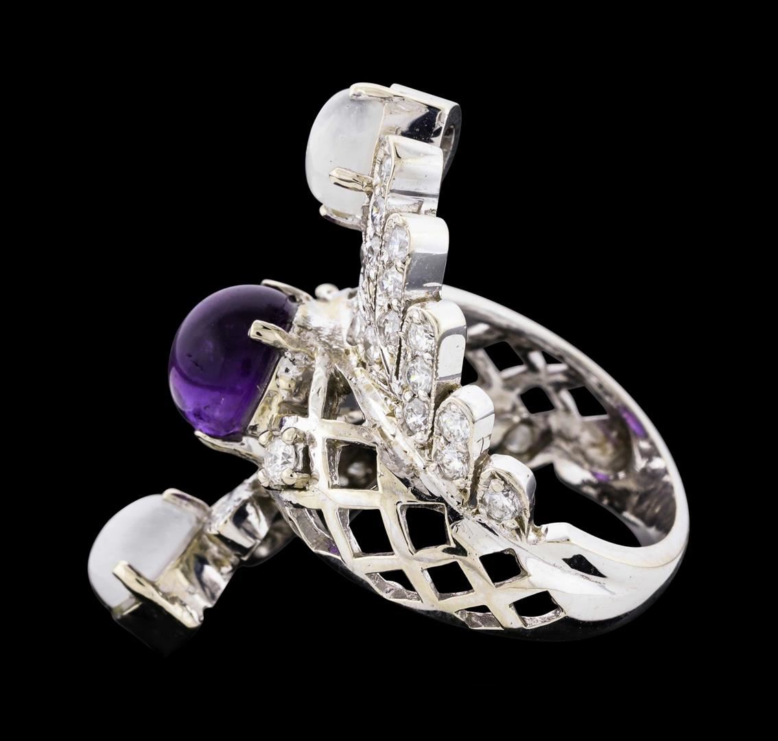 One electronically tested 14KT white gold lady's cast fashion ring with a bypass shank with a bright polish with milgrain detailing finish. The featured lady's ring has two mirrored floral bypass motifs and a shank measuring 3.48 millimeters wide. Identified with markings of "14K". Condition is new, good workmanship. Containing: One prong set round cabochon cut natural amethyst, measuring 8.16 x 8.04 x 5.00mm, (depth est.) approximate total weight of 2.36ct., clarity is eye clean, medium, moderately strong, purple color, (GIA P 5/4), cut is good. Transmitting light with no distortion, transparent. Colored gemstones are presumed to have been subjected to commonly used enhancement processes. Graded in the setting. Two prong set oval cabochon cut natural white tiger's eyes, measuring 6.53 x 5.00 x 3.43mm, (depth est.) approximate total weight of 2.00ct., clarity is moderately included, medium, very slightly grayish, white color, (GIA W 5/3), cut is good. Transmitting light somewhat diffusely, transparent to translucent. Colored gemstones are presumed to have been subjected to commonly used enhancement processes. Graded in the setting. Two prong set round brilliant cut diamonds, measuring 2.40 - 2.30 x 1.46mm (depth est.) approximate total weight of 2 Stones = 0.10ct. Graded in the setting. Clarity: SI-2 to I-1. Color: H - ICut Good Thirty-Four prong set round brilliant cut diamonds, measuring 2.00 - 1.90 x 1.21mm (depth est.) approximate total weight of 34 Stones = 0.95ct. Graded in the setting. Clarity: SI-1 to I-1. Color: H - ICut Good. Total Weight of Colored Stones 4.36ct. Total Weight of Diamonds 1.05ct. Total Weight of Ring 9.90gm. GAS Appraised.