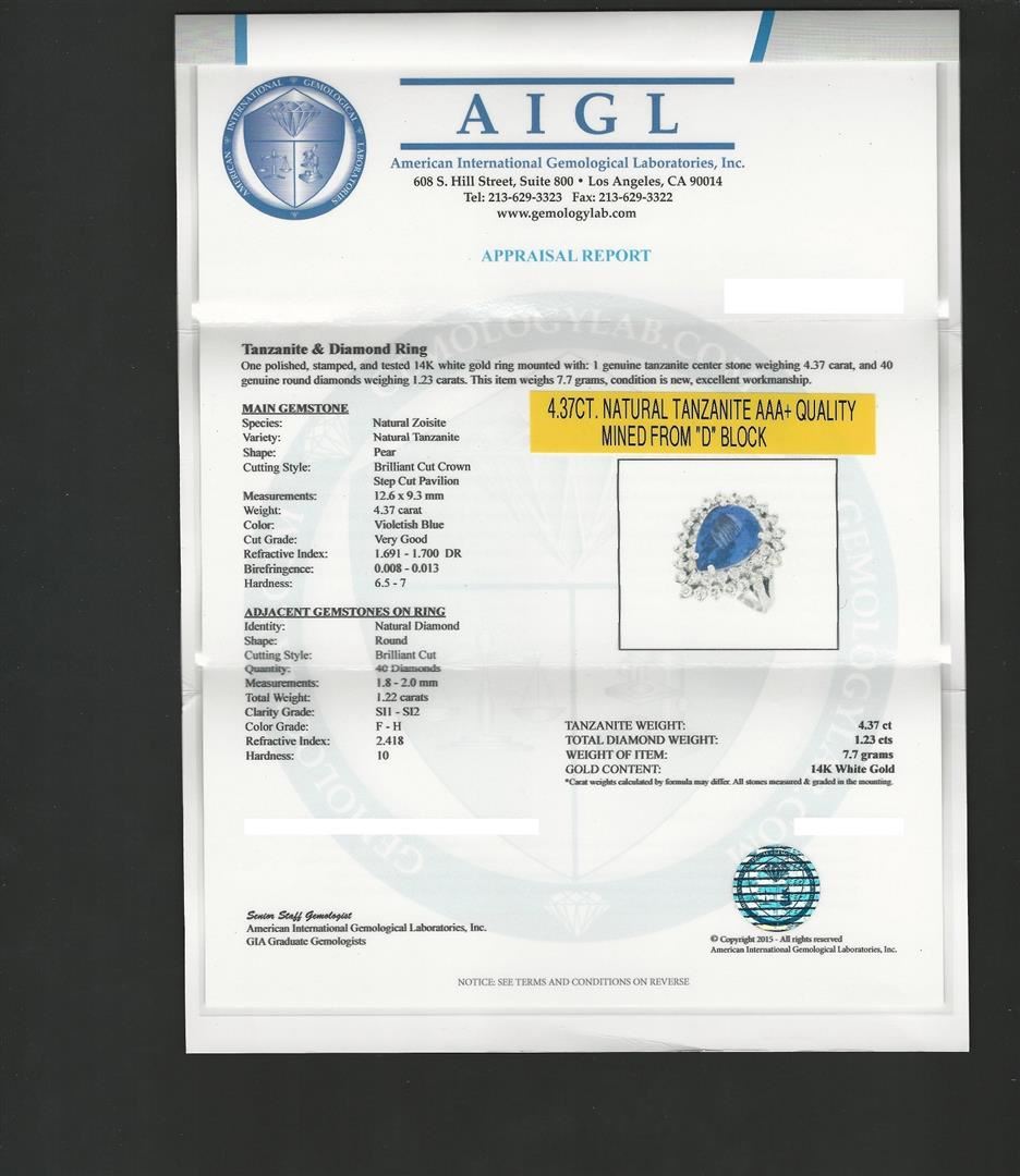 One polished, stamped, and tested 14K white gold ring mounted with: 1 genuine tanzanite center stone weighing 4.37 carat, and 40 genuine round diamonds weighing 1.23 carats. This item weighs 7.7 grams, condition is new, excellent workmanship. AIGL Appraised.