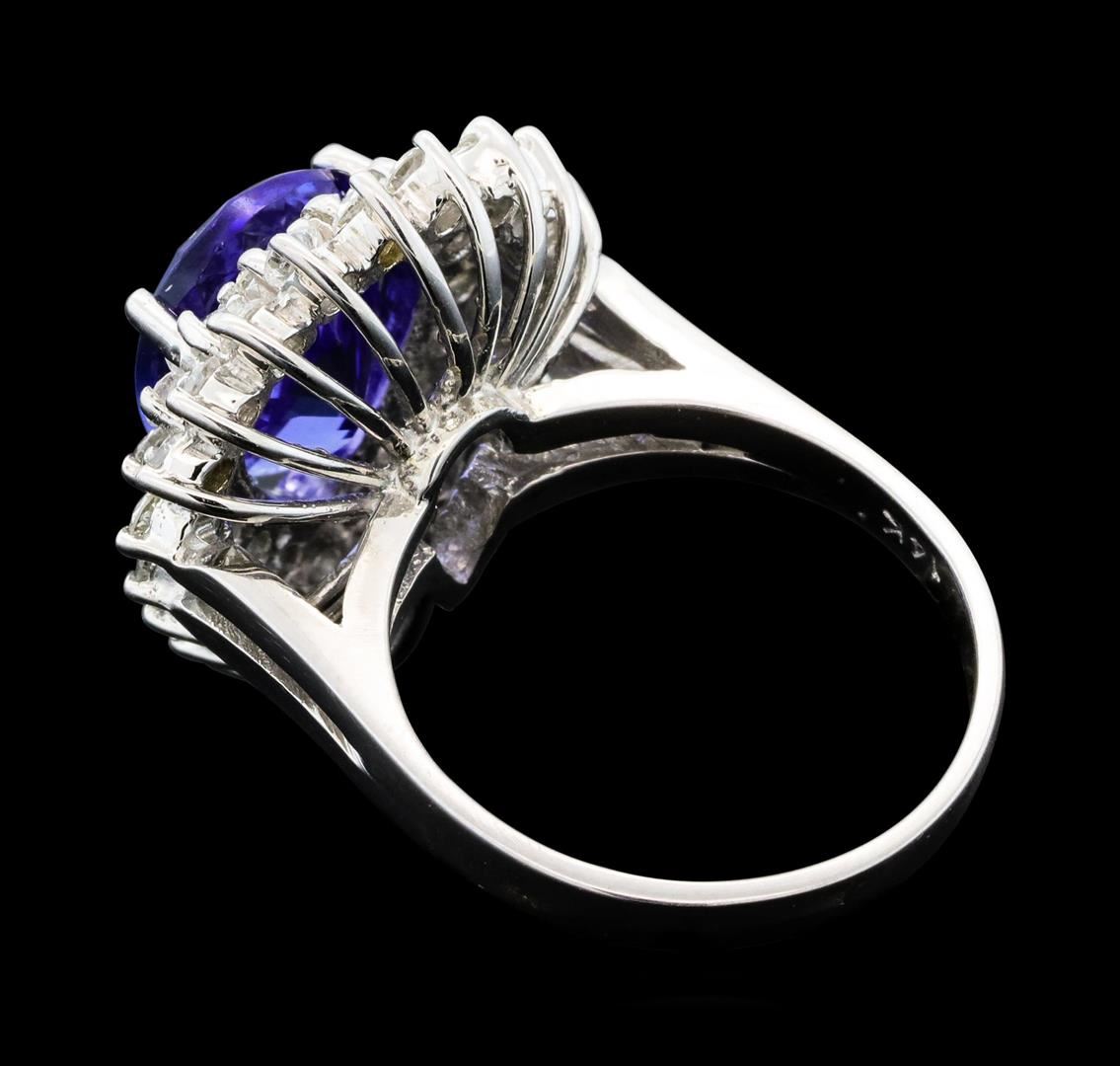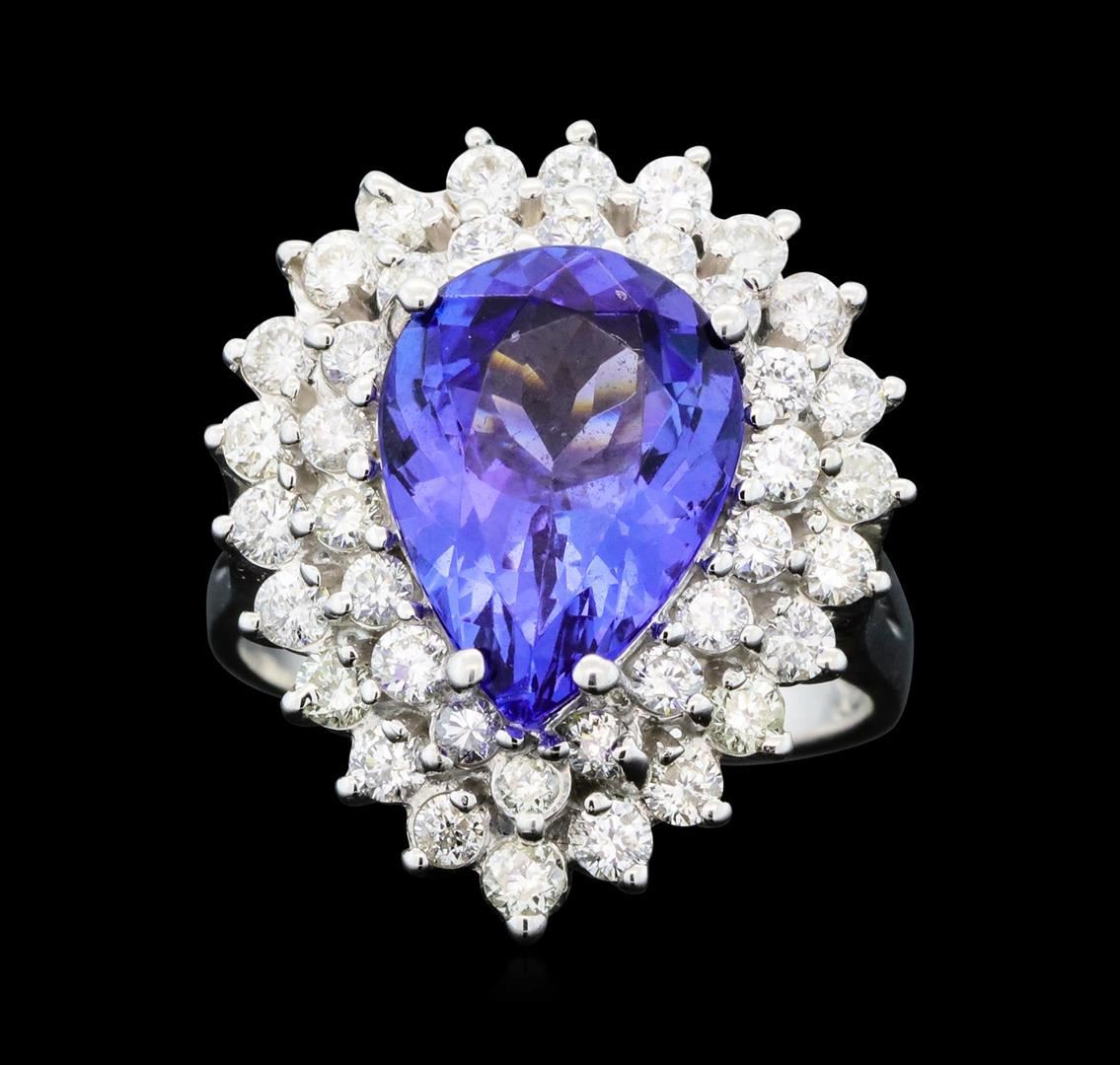 One polished, stamped, and tested 14K white gold ring mounted with: 1 genuine tanzanite center stone weighing 4.37 carat, and 40 genuine round diamonds weighing 1.23 carats. This item weighs 7.7 grams, condition is new, excellent workmanship. AIGL Appraised.
