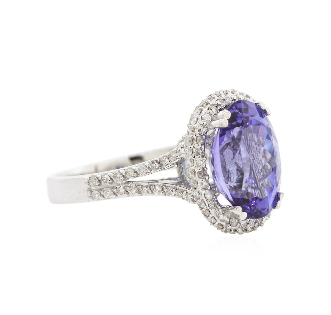 One electronically tested 14KT white gold lady's cast fashion ring with a split shank with a bright polish finish. The featured lady's ring has a halo motif and a shank measuring 2.66 millimeters wide. Identified with markings of "K14". Condition is new, good workmanship. Containing: One prong set oval modified brilliant cut natural tanzanite, measuring 11.83 x 8.48 x 6.20mm, 5% bulge factor, approximate weight of 4.65ct., clarity is eye clean, type I, medium, very slightly grayish, violetish blue color, (GIA vB 5/3), cut is good. Transmitting light with no distortion, transparent. Colored gemstones are presumed to have been subjected to commonly used enhancement processes. Graded in the setting. One Hundred Ten prong set round brilliant cut diamonds, measuring 1.10 - 1.00 x 0.68mm (depth est.) approximate total weight of 110 Stones = 0.50ct. Graded in the setting. Clarity: SI-2 to I-1. Color: H - I. Cut Good. Total Weight of Colored Stones 4.65ct. Total Weight of Diamonds 0.50ct. Total Weight of Ring 5.40gm. GAS Appraised at $8,150.00.