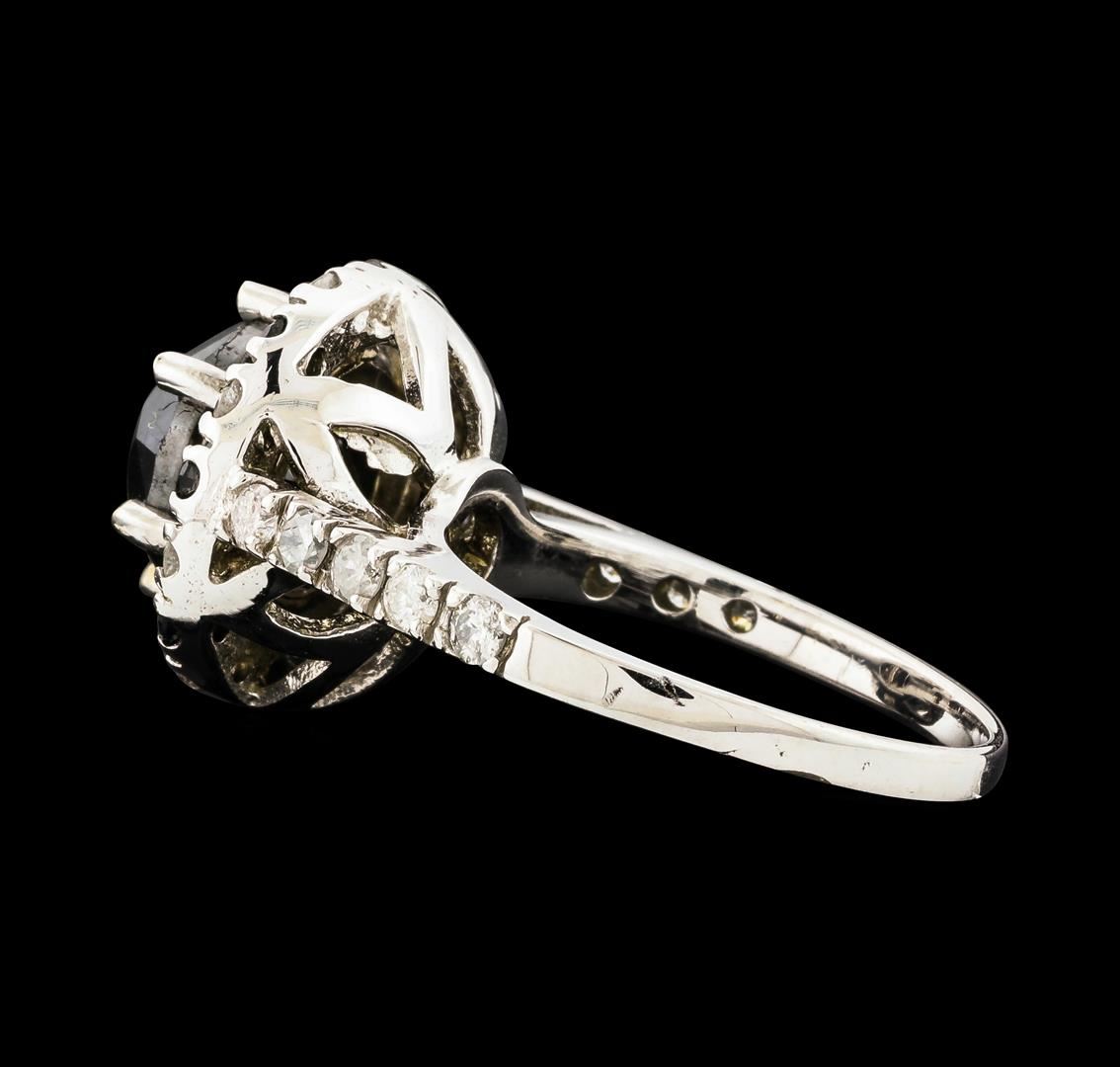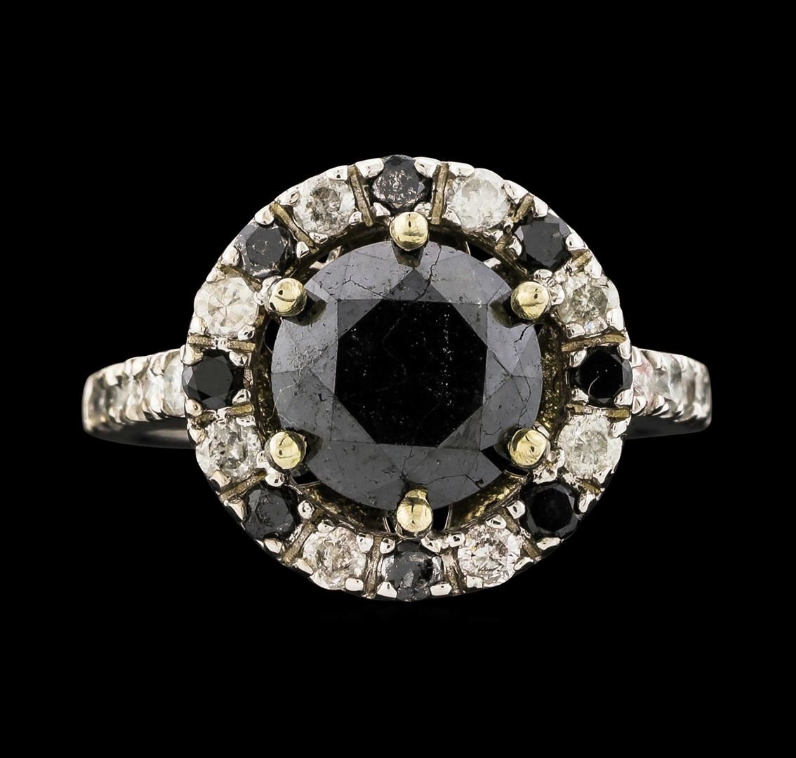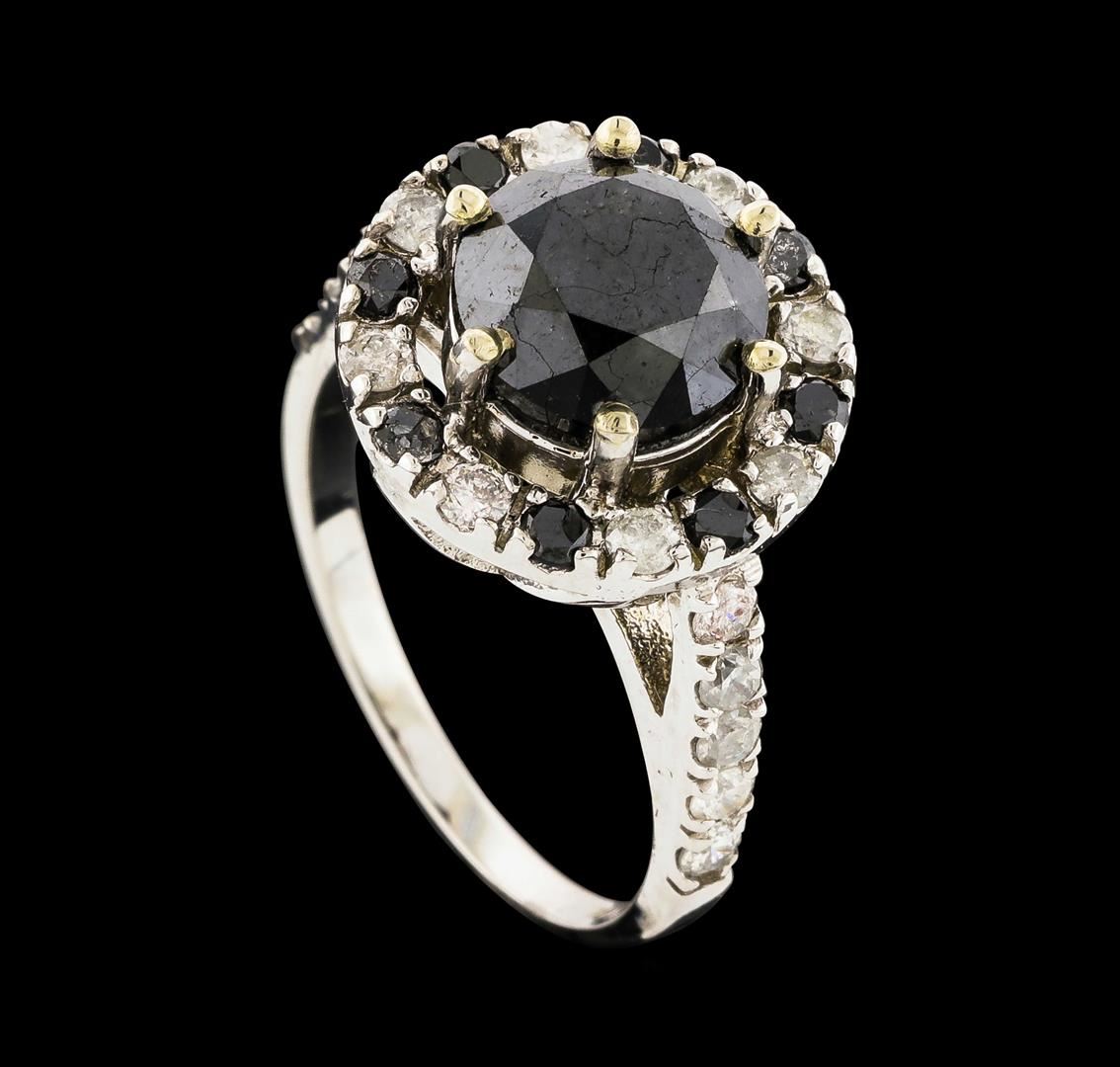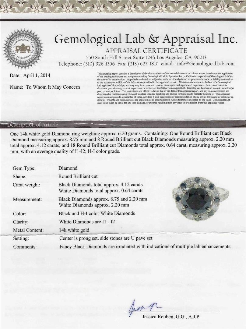 One 14k white gold Diamond ring weighing approx. 6.20 grams. Containing: One Round Brilliant cut Black Diamond measuring approx. 8.75 mm and 8 Round Brilliant cut Black Diamonds measuring approx. 2.20 mm total approx. 4.12 carats; and 18 Round Brilliant cut Diamonds total approx. 0.64 carat, measuring approx. 2.20mm, with an average quality of (I1-I2); H-I color grade. GLA Appraised.