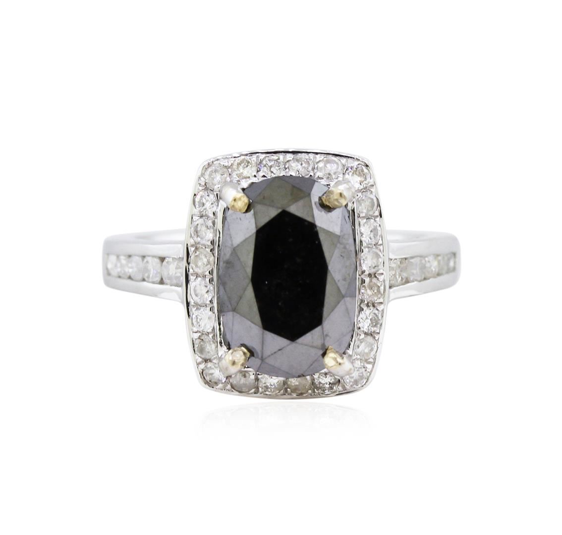 One electronically tested 14KT white gold ladies cast black and white diamond ring with bright polish finish. Condition is new, good workmanship. The featured black diamond is set within a white diamond bezel, supported by white diamond set shoulders and completed by a two milimeter wide band. Trademark is Orianne. Identified with markings of "14K". Containing: One cushion cut black diamond, measuring 11.50 x 7.90 x 4.70mm, 15.00% GTCF approximate weight of 4.19ct. Indications of multiple labratory enhancements. The specific gravity of black diamond is 3.120 to 3.165. Diamond tester results are non reactive. Graded in setting. Thirty-four prong and channel set round brilliant cut diamonds, average clarity I-1 to I-3, measuring 2.10 - 1.50 x 1.09mm (depth est.) approximate total weight of 34 stones = 0.64ct. Graded in setting. AIG Appraised at $6,900.00.