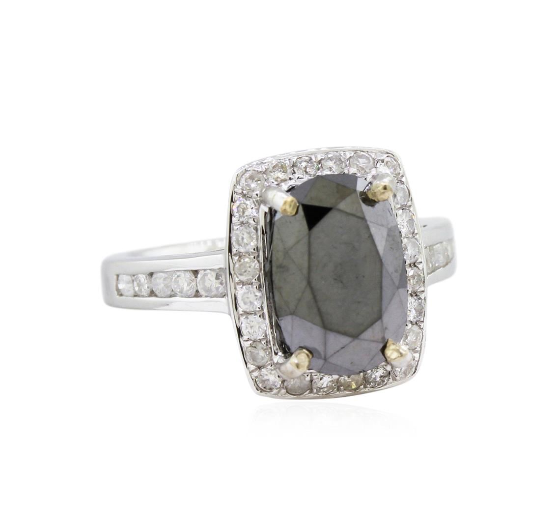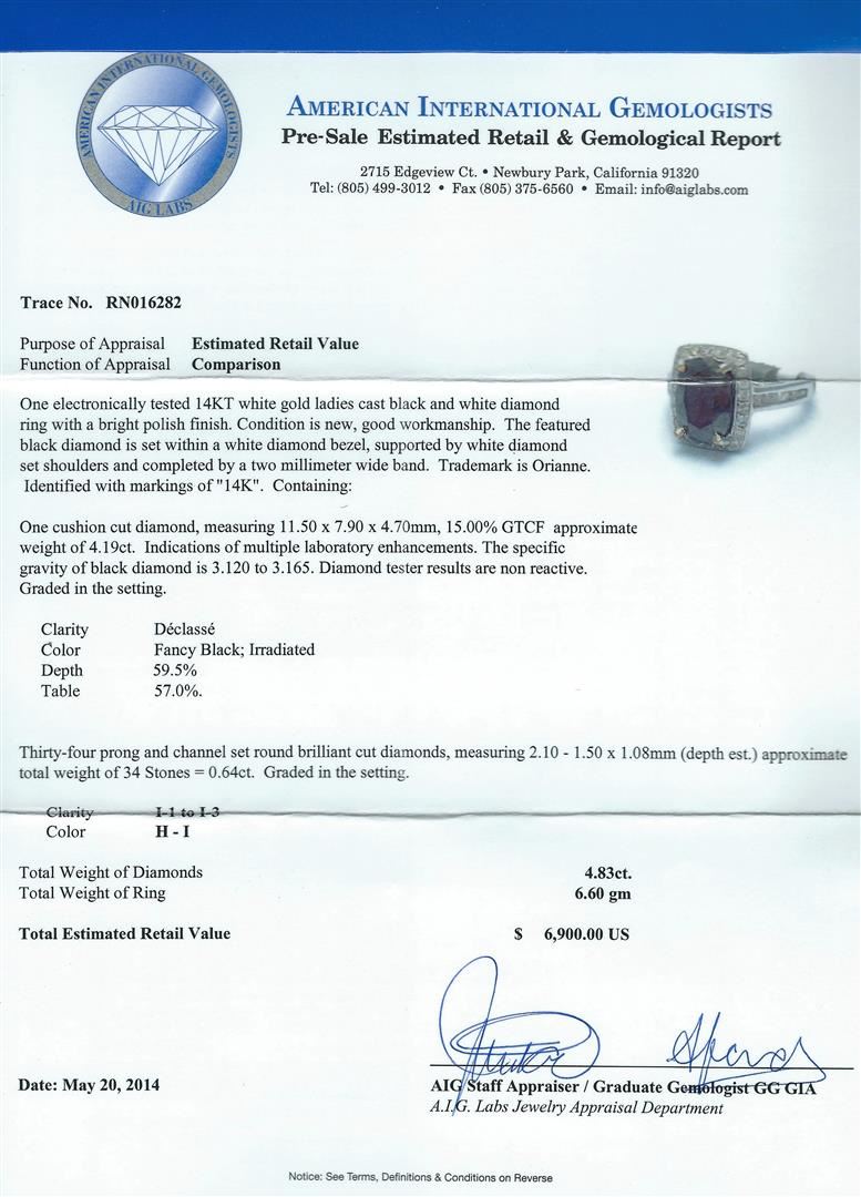 One electronically tested 14KT white gold ladies cast black and white diamond ring with bright polish finish. Condition is new, good workmanship. The featured black diamond is set within a white diamond bezel, supported by white diamond set shoulders and completed by a two milimeter wide band. Trademark is Orianne. Identified with markings of "14K". Containing: One cushion cut black diamond, measuring 11.50 x 7.90 x 4.70mm, 15.00% GTCF approximate weight of 4.19ct. Indications of multiple labratory enhancements. The specific gravity of black diamond is 3.120 to 3.165. Diamond tester results are non reactive. Graded in setting. Thirty-four prong and channel set round brilliant cut diamonds, average clarity I-1 to I-3, measuring 2.10 - 1.50 x 1.09mm (depth est.) approximate total weight of 34 stones = 0.64ct. Graded in setting. AIG Appraised at $6,900.00.