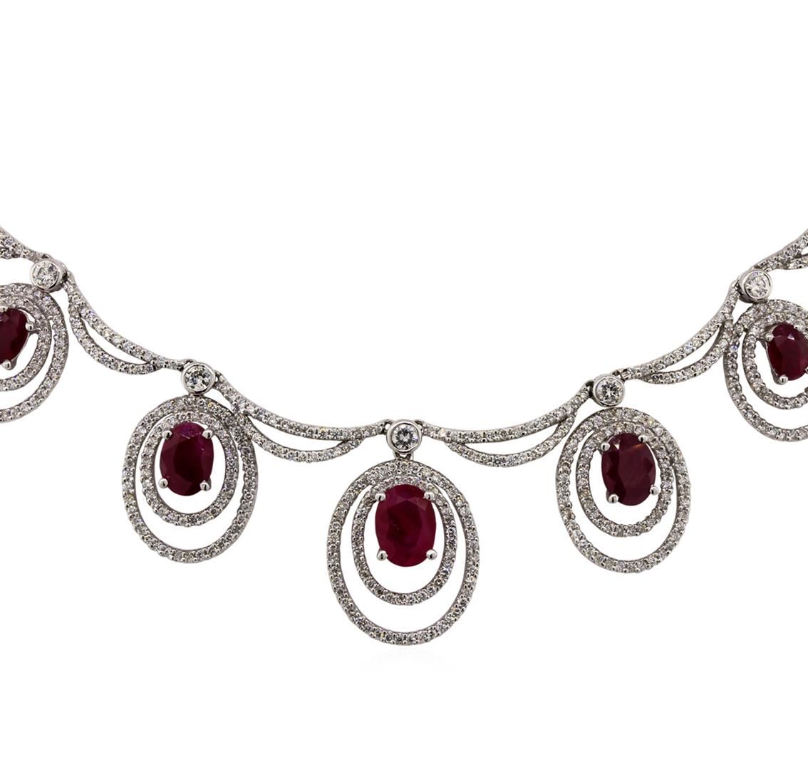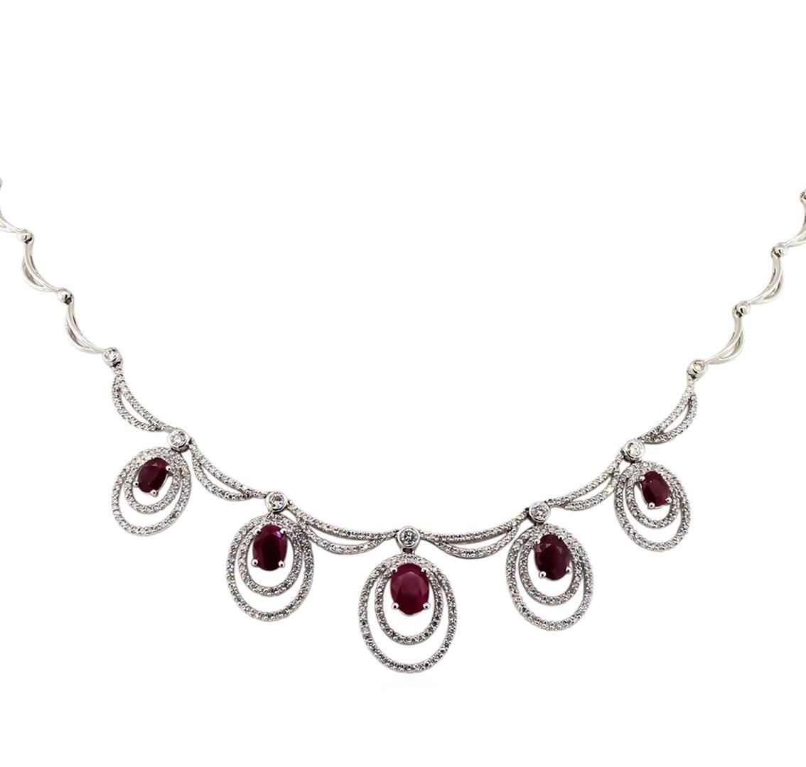 Stunning ruby and diamond necklace featuring 20.33 grams of 14KT white gold. Four hundred and seventy-two round diamonds weighing 2.30 carats brilliantly showcase five oval shaped ruby gemstones totaling 4.85 carats.