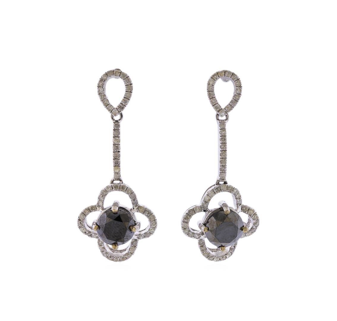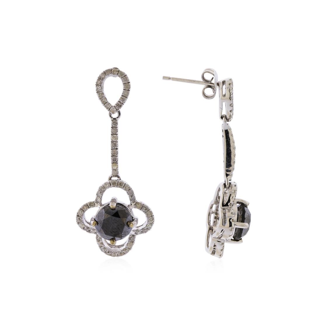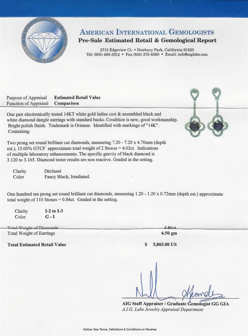 One pair electronically tested 14KT white gold ladies cast & assembled black and white diamond dangle earrings with standard backs. Bright polish finish. Trademark is Orianne. Identified with markings of "14K". Condition is new, good workmanship. Containing: Two prong set round brilliant cut diamonds, measuring 7.20 - 7.20 x 4.70mm (depth est.), 15.00.%. GTCF approximate total weight of 2 Stones = 4.02ct. Indications of multiple laboratory enhancements. The specific gravity of black diamond is 3.120 to 3.165. Diamond tester results are non reactive. Graded in the setting. Clarity D‚class‚. Color: Fancy Black; Irradiated. One Hundred Ten prong set round brilliant cut diamonds, measuring 1.20 - 1.20 x 0.72mm (depth est.) approximate total weight of 110 Stones = 0.84ct. Graded in the setting. Clarity: I-2 to I-3. Color: G - I. Total Weight of Diamonds 4.86ct. AIG Appraised at $5,865.00.