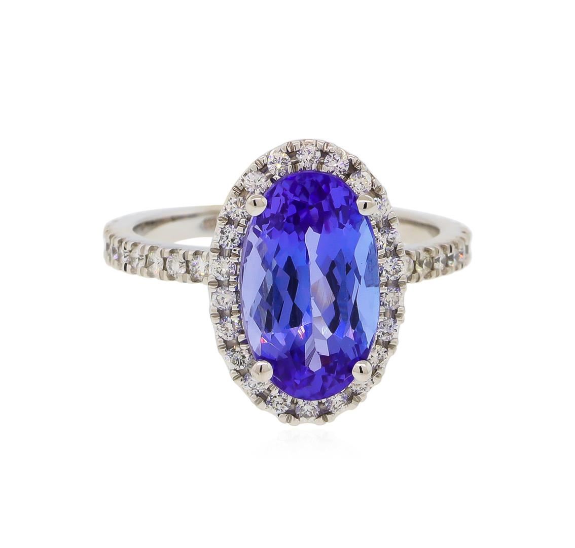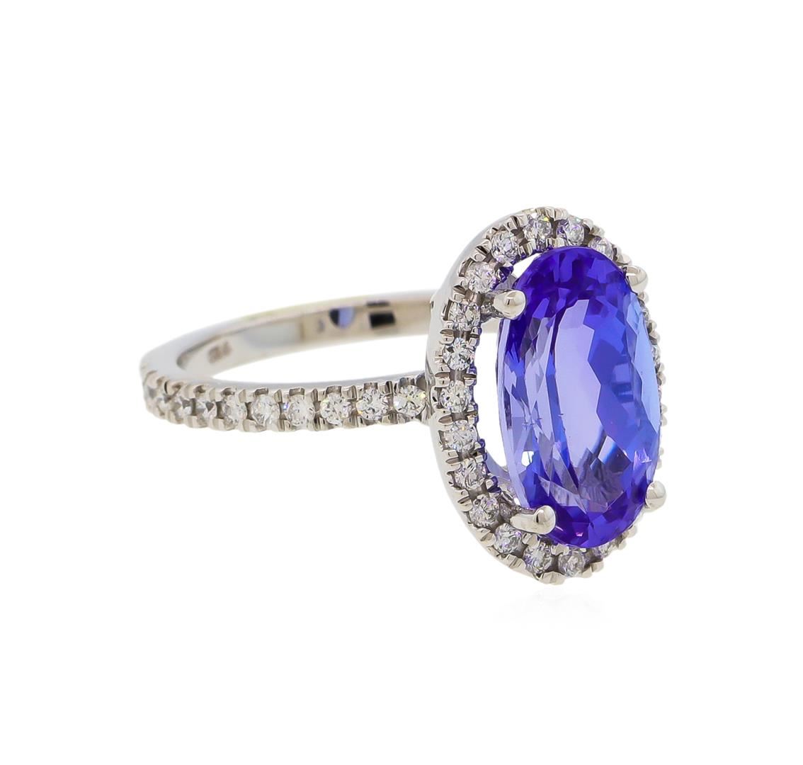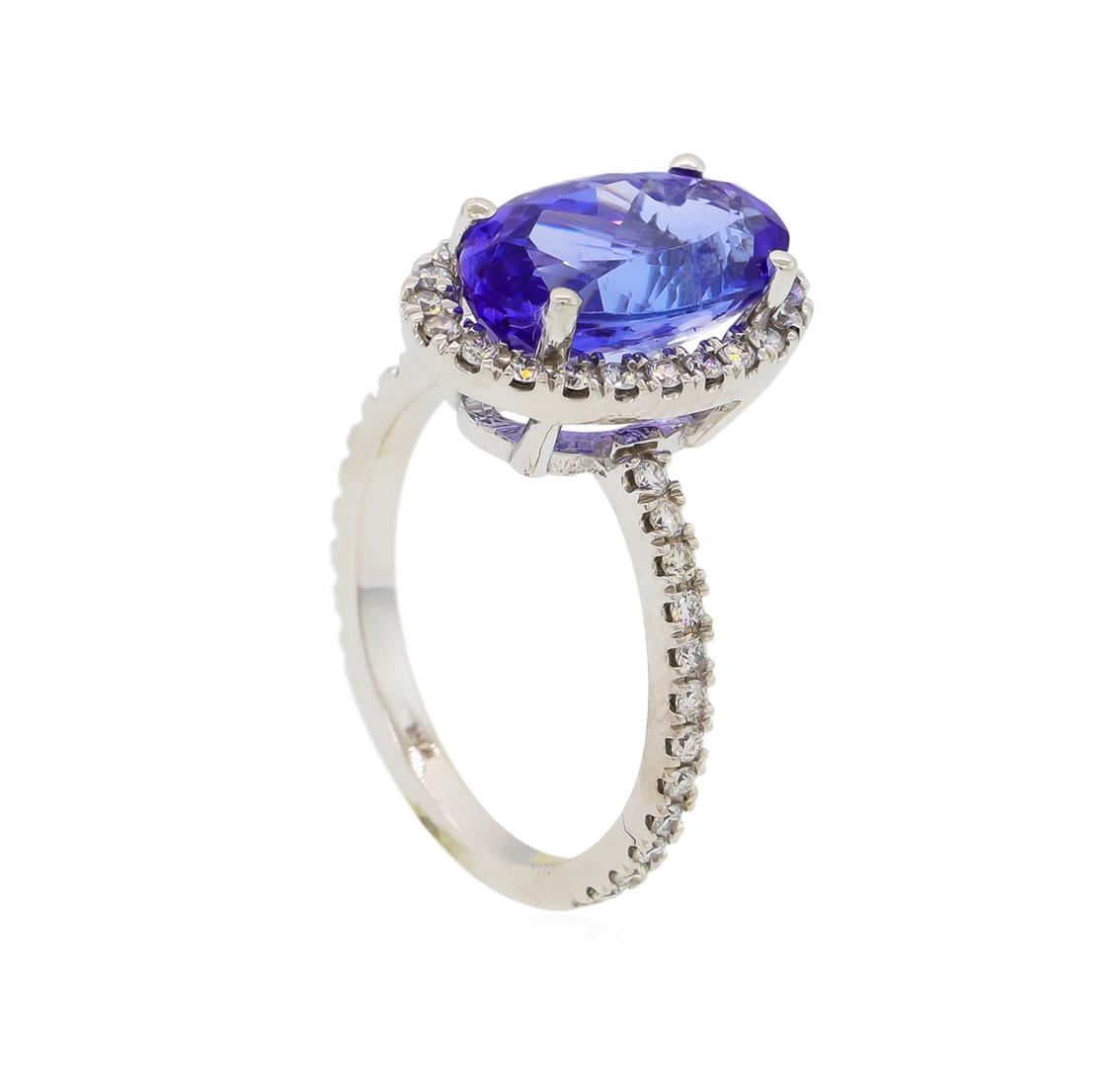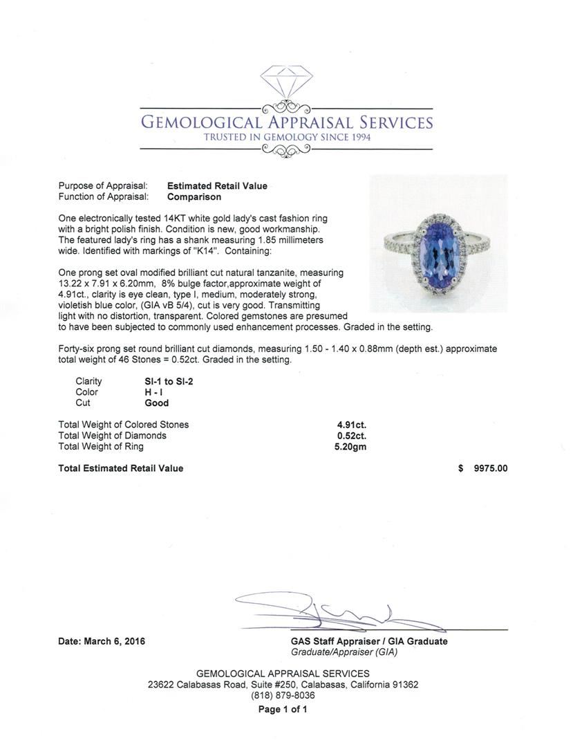 One electronically tested 14KT white gold lady's cast fashion ring with a bright polish finish. The featured lady's ring has a shank measuring 1.85 millimeters wide. Identified with markings of "K14". Condition is new, good workmanship. Containing: One prong set oval modified brilliant cut natural tanzanite, measuring 13.22 x 7.91 x 6.20mm, 8%. bulge factor, approximate weight of 4.91ct., clarity is eye clean, type I, medium, moderately strong, violetish blue color, (GIA vB 5/4), cut is very good. Transmitting light with no distortion, transparent. Colored gemstones are presumed to have been subjected to commonly used enhancement processes. Graded in the setting. Forty-Six prong set round brilliant cut diamonds, measuring 1.50 - 1.40 x 0.88mm (depth est.) approximate total weight of 46 Stones = 0.52ct. Graded in the setting. Clarity: SI-1 to SI-2. Color: H - I, Cut Good. Total Weight of Colored Stones 4.91ct. Total Weight of Diamonds 0.52ct. Total Weight of Ring 5.20gm. GAS Appraised at $9,975.00.
