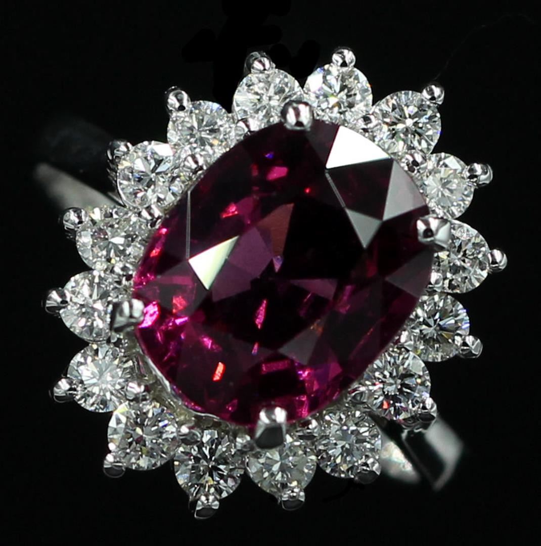 One Oval Cut Pink Rhodolite Anniversary Diamond Band Ring in 14k White Gold. Size 6.5 but resizable. Total carat weight is 4.97 Ct. The ring design is solitaire with accents / halo design. Gross weight 4.96 grams. Total stones 17. Condition is brand new. Main stone is natural and non-enhanced, 4.16 Ct, shape oval, clarity good, color rhodolite, and cut is very good. Side stone is natural and non-enhanced. Side diamonds total carat is 0.81 Ct. Side diamond shape is brilliant round cut, clarity SI-1, color G, cut very good, and number of side diamonds is 16.