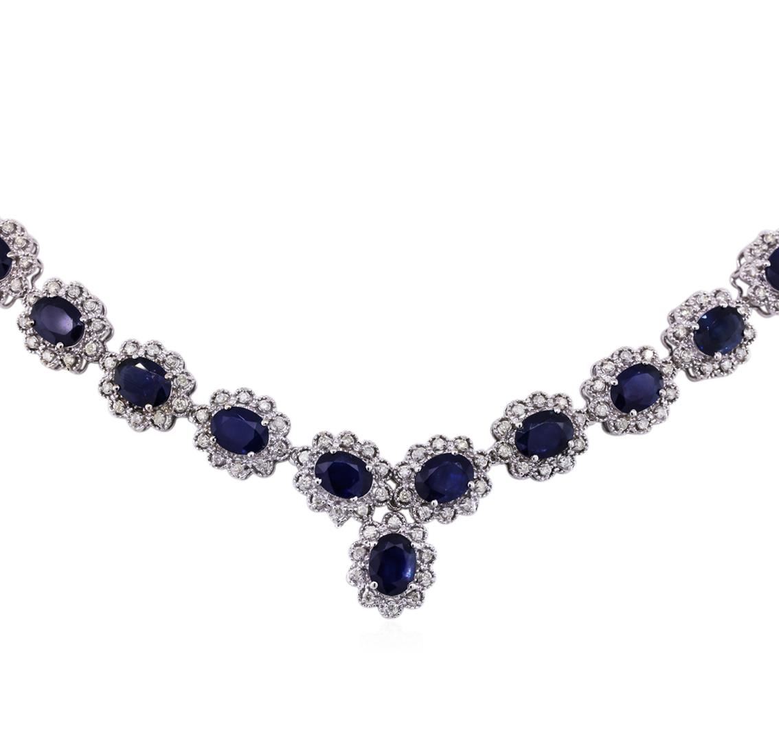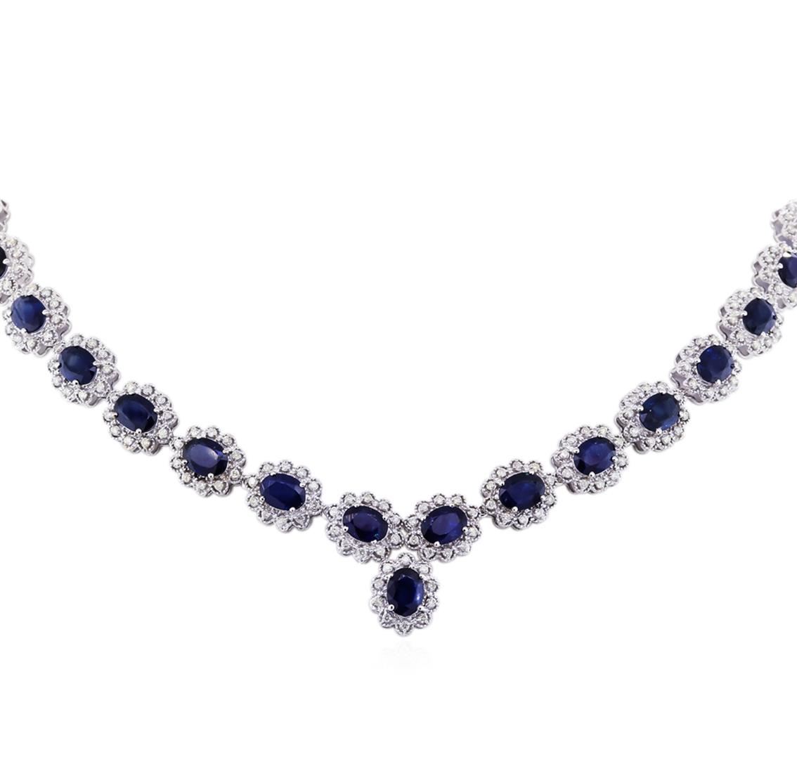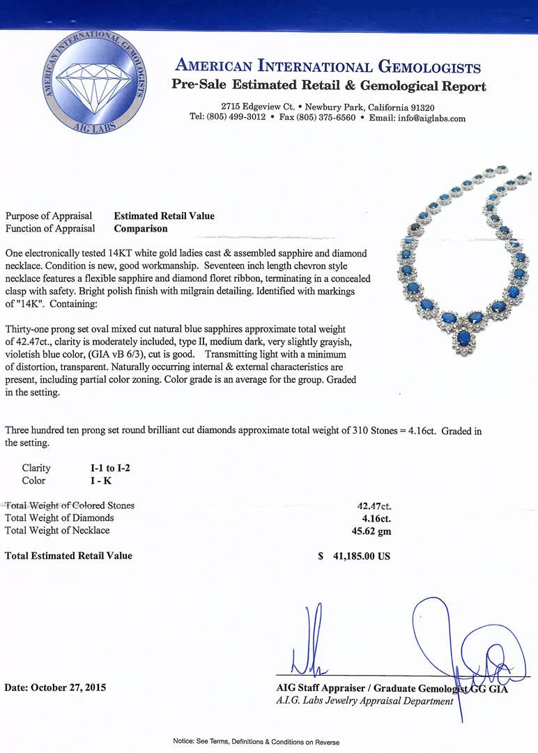 One electronically tested 14KT white gold ladies cast & assembled sapphire and diamond necklace. Seventeen inch length chevron style necklace features a flexible sapphire and diamond floret ribbon, terminating in a concealed clasp with safety. Bright polish finish with milgrain detailing. Identified with markings of "14K". Condition is new, good workmanship. Containing: Thirty-one prong set oval mixed cut natural blue sapphires approximate. Total Weight of 42.47ct., clarity is moderately included, type II, medium dark, very slightly grayish, violetish blue color, (GIA vB 6/3), cut is good. Transmitting light with a minimum of distortion, transparent. Naturally occurring internal & external characteristics are present, including partial color zoning. Color grade is an average for the group. Gradedin the setting.Three Hundred Ten prong set round brilliant cut diamonds approximate. Total Weight of 310 Stones = 4.16ct. Graded in the setting. Clarity: I-1 to I-2. Color: I - K. Total Weight of Colored Stones 42.47ct. Total Weight of Diamonds 4.16ct. Total Weight of Necklace 45.62gm. AIG Appraised at $41,185.00.
