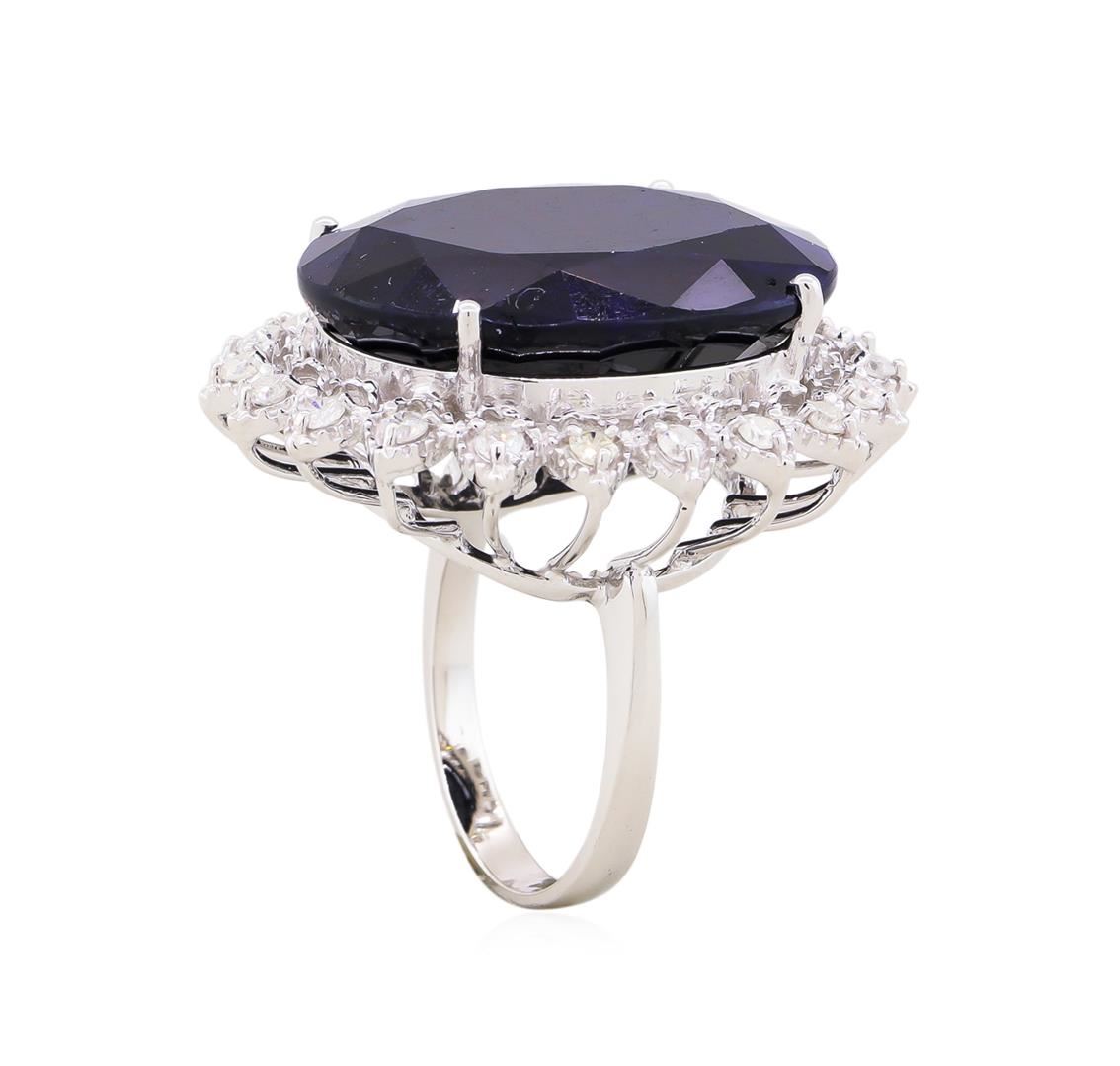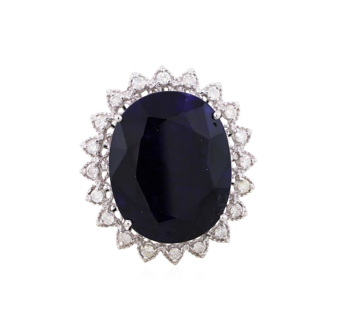 Fourteen Karat (14K) White Gold Sapphire And Diamond Ring. An Oval Cut Sapphire Corundum Gemstone Is Prong Mounted In The Center Of The Ring, Round Brilliant Cut Diamonds Accent The Ring Around The Center Gemstone. The Ring Is Cast Stamped "14K" And Has A Gross Weight Of 17.1 Grams. Diamonds: Shape: Round Brilliant Cut, Weight: 0.80 Carat, Average Clarity: Il, Average Color: H-J, Symmetry: Very Good, Polish: Very Good, Gemstone: Sapphire Corundum. Nature: Natural, Shape: Oval, Faceted, Quantity; 1 Mounted, Weight: 42.51 Carat, Center Stone Dimensions: Length-24.40 Mm; Width 19.53 Mm. Bulge: Visible, Clarity Si Type 3, Color: Blue (5/5), Symmetry: Very Good, Color Intensity: Medium, Transparency: Transparent, Tone: Dark. Comments: Indications Of High Temperature And Diffusion. Metal: Gold Stamped, Purity: 14K, Color: White, Condition: Excellent, Finish: High Polish. GGA Appraised at $7,890.00.