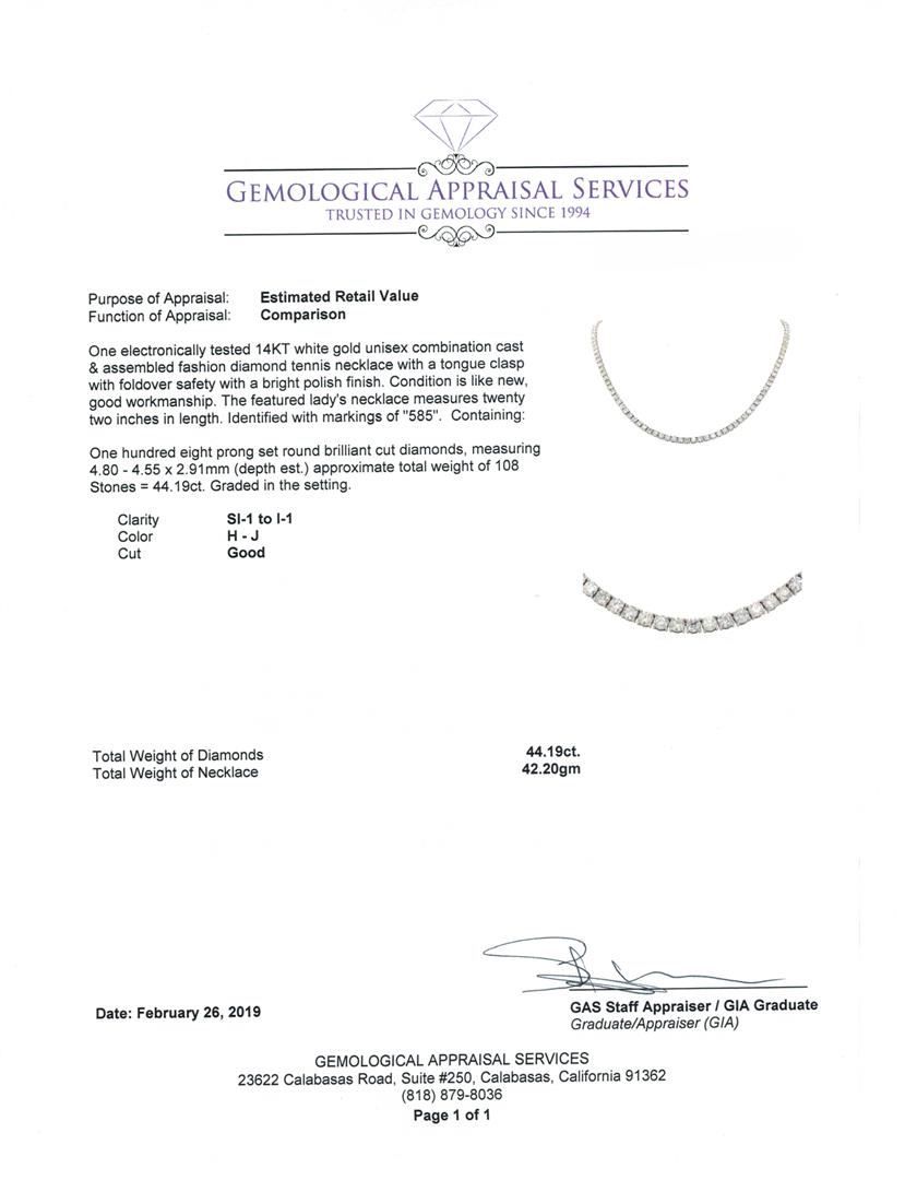 One electronically tested 14KT white gold unisex combination cast & assembled fashion diamond tennis necklace with a tongue clasp with foldover safety with a bright polish finish. The featured lady's necklace measures twenty two inches in length. Identified with markings of '585'. Condition is like new, good workmanship. Containing: One Hundred Eight prong set round brilliant cut diamonds, measuring 4.80 - 4.55 x 2.91mm (depth est.) approximate total weight of 108 Stones = 44.19ct. Graded in the setting. Color H - J, Clarity SI-1 to I-1, Cut Good. Total Weight of Diamonds 44.19ct. Total Weight of Necklace 42.20gm. GAS Appraised.