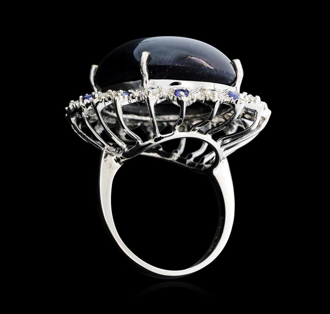 One polished, stamped, and electronically tested solid 14k white gold ring mounted with 1 genuine star sapphire center stone weighing 44.70 carat, 10 genuine round tanzanite weighting 0.38 carats, and 10 genuine round diamonds weighing 0.44 carats. This item weighs 17.5 grams, condition is new, excellent workmanship. 1 star sapphire with a total weight of 44.70cts. 10 sapphires with a total weight of 0.38cts. 10 diamonds with a total weight of 0.44cts. AIGL Appraised.