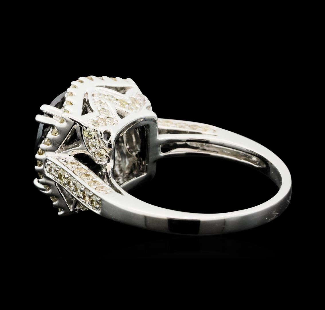 One electronically tested 14KT white gold lady's cast fashion ring with a cathedral shank with a basket halo with a bright polish finish. The featured lady's ring has a shank measuring 2.16 millimeters wide. Identified with markings of "585". Condition is new, good workmanship. Containing: One prong set square cushion modified mixed cut natural black onyx, measuring 10.90 x 10.88 x 6.85mm, (depth est.) approximate weight of 5.00ct., black, strong, black color, (GIA Bl 10/5), cut is very good. Colored gemstones are presumed to have been subjected to commonly used enhancement processes. Graded in the setting.Thirty-Two prong set round brilliant cut diamonds, measuring 1.60 - 1.50 x 0.96mm (depth est.) approximate total weight of 32 Stones = 0.45ct. Graded in the setting. Clarity: SI-1 to SI-2. Color: I - JCut Good Sixty-Six prong set round brilliant cut diamonds, measuring 1.40 - 1.20 x 0.81mm (depth est.) approximate total weight of 66 Stones = 0.55ct. Graded in the setting. Clarity: SI-1 to SI-2. Color: J - KCut Good. Total Weight of Colored Stones 5.00ct. Total Weight of Diamonds 1.00ct. Total Weight of Ring 8.60gm. GAS Appraised.
