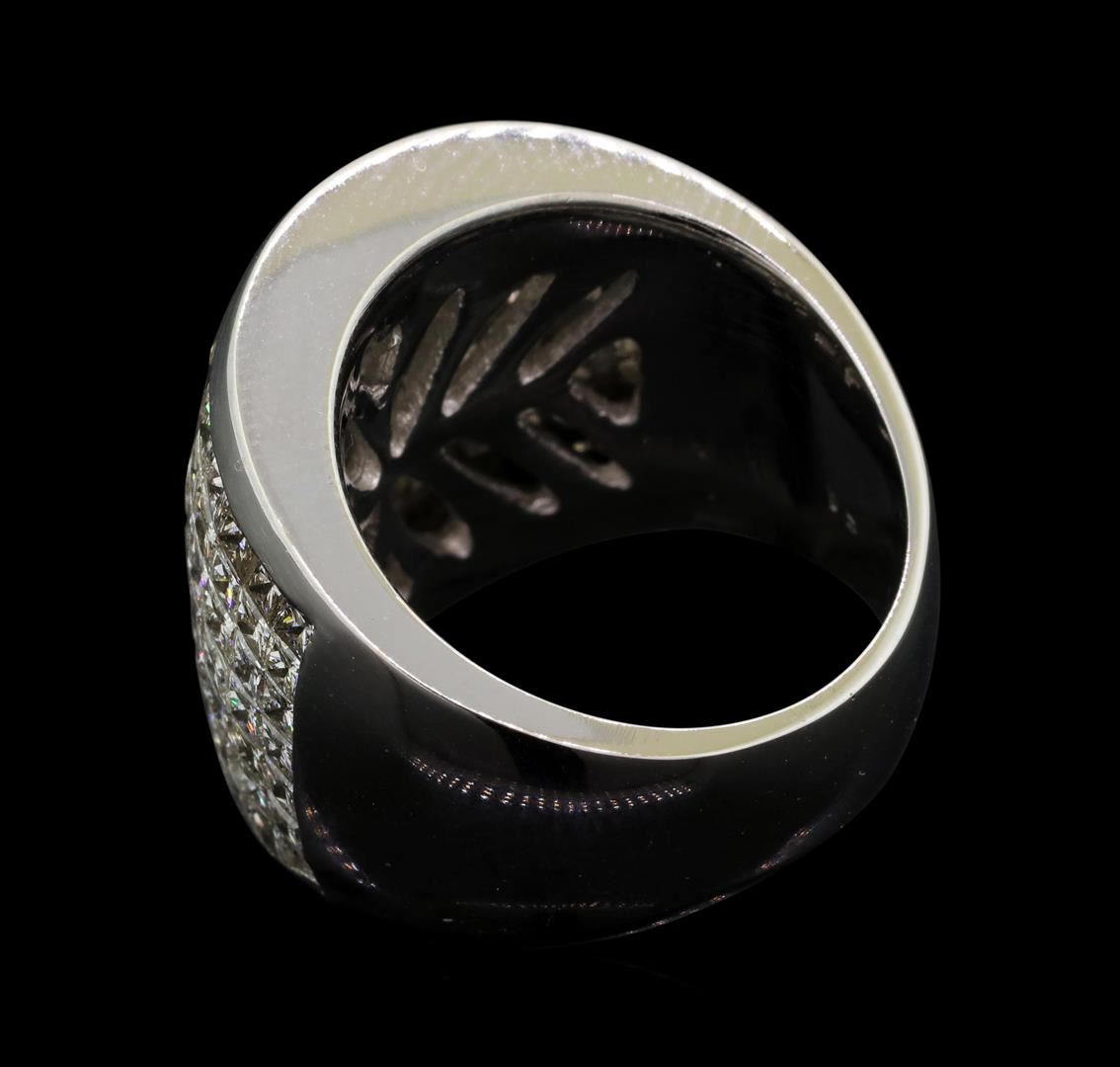 One electronically tested 14KT white gold lady's cast fashion ring with a wide band dome with a bright polish finish. The featured lady's ring has a shank measuring 6.80 millimeters wide. Identified with markings of "14K". Condition is new, good workmanship. Containing: One Hundred Five invisible set princess cut diamonds, measuring 2.50 x 1.70 x 1.28mm (depth est.) approximate total weight of 105 Stones = 5.00ct. Graded in the setting. Color H - I Clarity VS-2 to SI-2 Cut Very Good. Total Weight of Diamonds 5.00ct. Total Weight of Ring 20.10gm. GAS Appraised.