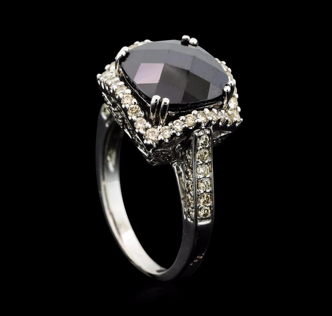 One electronically tested 14KT white gold lady's cast fashion ring with a cathedral shank with a basket halo with a bright polish finish. The featured lady's ring has a shank measuring 2.16 millimeters wide. Identified with markings of "585". Condition is new, good workmanship. Containing: One prong set square cushion modified mixed cut natural black onyx, measuring 10.90 x 10.88 x 6.85mm, (depth est.) approximate weight of 5.00ct., black, strong, black color, (GIA Bl 10/5), cut is very good. Colored gemstones are presumed to have been subjected to commonly used enhancement processes. Graded in the setting.Thirty-Two prong set round brilliant cut diamonds, measuring 1.60 - 1.50 x 0.96mm (depth est.) approximate total weight of 32 Stones = 0.45ct. Graded in the setting. Clarity: SI-1 to SI-2. Color: I - JCut Good Sixty-Six prong set round brilliant cut diamonds, measuring 1.40 - 1.20 x 0.81mm (depth est.) approximate total weight of 66 Stones = 0.55ct. Graded in the setting. Clarity: SI-1 to SI-2. Color: J - KCut Good. Total Weight of Colored Stones 5.00ct. Total Weight of Diamonds 1.00ct. Total Weight of Ring 8.60gm. GAS Appraised.