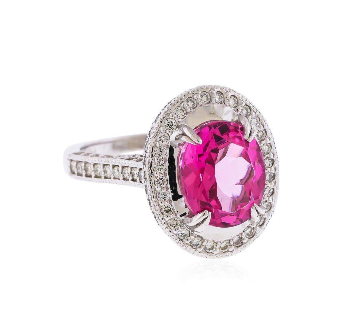 Fourteen karat (14K) white gold pink topaz and diamond ring. An oval cut 5.00ctw pink topaz gemstone is prong mounted in the center of the ring. Round brilliant cut diamonds weighing 1.28ctw accent the ring around and on both sides of the center gemstone. The ring is cast stamped "14K" and has a gross weight of 8.1 Grams. GGA Appraised at $3,390.00.