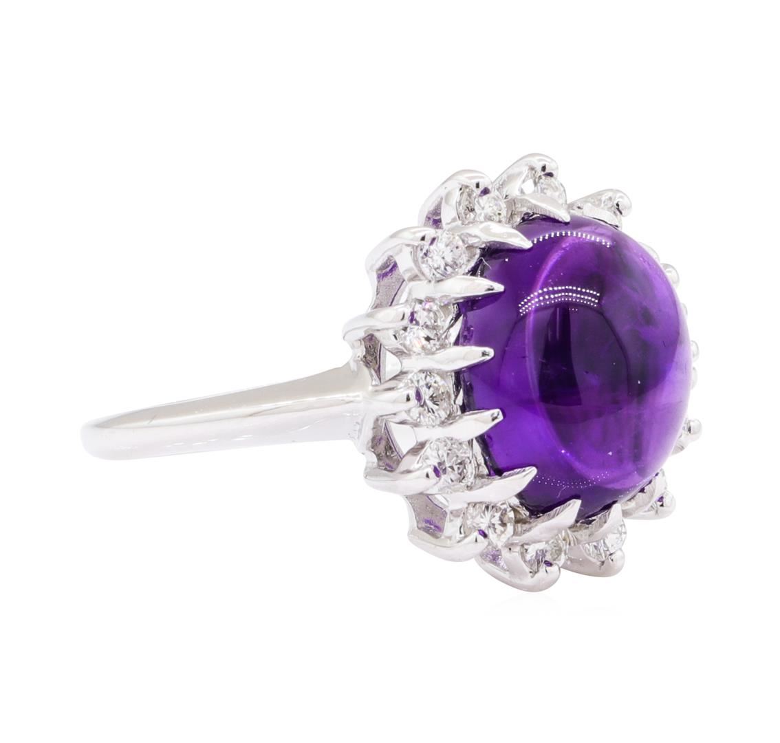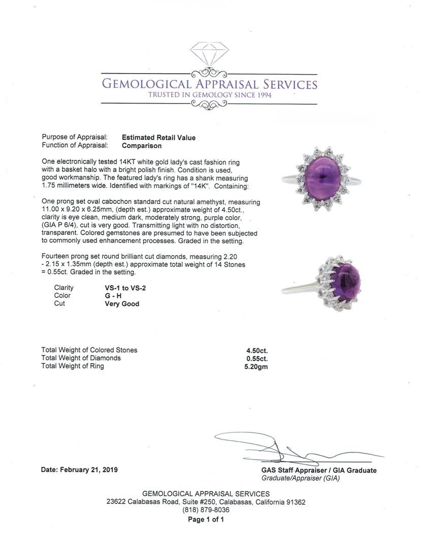 One electronically tested 14KT white gold lady's cast fashion ring with a basket halo with a bright polish finish. The featured lady's ring has a shank measuring 1.75 millimeters wide. Identified with markings of '14K'. Condition is used, good workmanship. Containing: One prong set oval cabochon standard cut natural amethyst, measuring 11.00 x 9.20 x 6.25mm, (depth est.) approximate weight of 4.50ct.,, Clarity is eye clean, medium dark, moderately strong, purple color, (GIA P 6/4), cut is very good. Transmitting light with no distortion, transparent. Colored gemstones are presumed to have been subjected to commonly used enhancement processes. Graded in the setting. Fourteen prong set round brilliant cut diamonds, measuring 2.20 - 2.15 x 1.35mm (depth est.) approximate total weight of 14 Stones = 0.55ct. Graded in the setting. Color G - H, Clarity VS-1 to VS-2, Cut Very Good. Total Weight of Colored Stones 4.50ct. Total Weight of Diamonds 0.55ct. Total Weight of Ring 5.20gm. GAS Appraised.