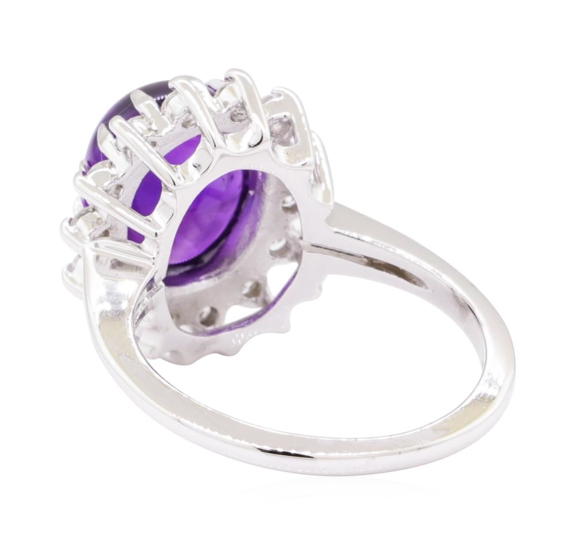 One electronically tested 14KT white gold lady's cast fashion ring with a basket halo with a bright polish finish. The featured lady's ring has a shank measuring 1.75 millimeters wide. Identified with markings of '14K'. Condition is used, good workmanship. Containing: One prong set oval cabochon standard cut natural amethyst, measuring 11.00 x 9.20 x 6.25mm, (depth est.) approximate weight of 4.50ct.,, Clarity is eye clean, medium dark, moderately strong, purple color, (GIA P 6/4), cut is very good. Transmitting light with no distortion, transparent. Colored gemstones are presumed to have been subjected to commonly used enhancement processes. Graded in the setting. Fourteen prong set round brilliant cut diamonds, measuring 2.20 - 2.15 x 1.35mm (depth est.) approximate total weight of 14 Stones = 0.55ct. Graded in the setting. Color G - H, Clarity VS-1 to VS-2, Cut Very Good. Total Weight of Colored Stones 4.50ct. Total Weight of Diamonds 0.55ct. Total Weight of Ring 5.20gm. GAS Appraised.