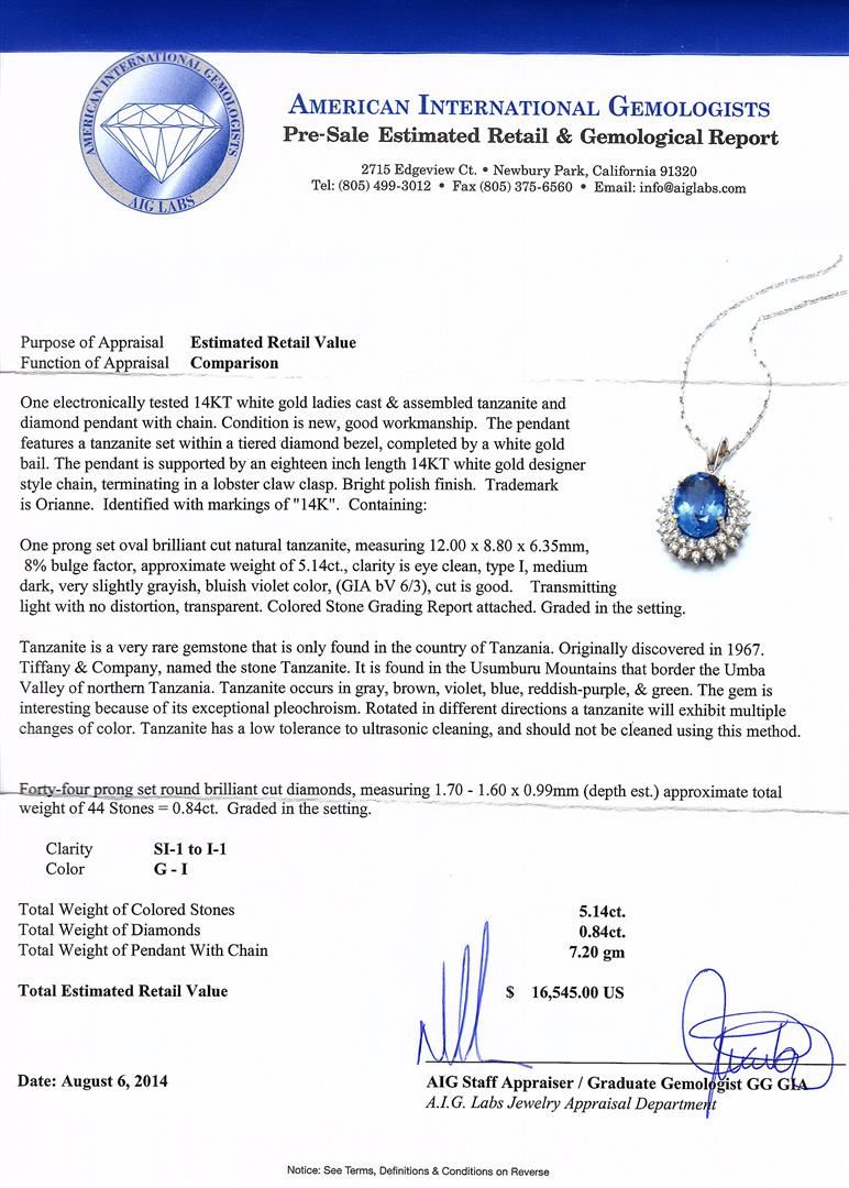 One electronically tested 14KT white gold ladies cast & assembled tanzanite and diamond pendant with chain. The pendant features a tanzanite set within a tiered diamond bezel, completed by a white gold bail. The pendant is supported by an eighteen inch length 14KT white gold designer style chain, terminating in a lobster claw clasp. Bright polish finish. Trademark is Orianne. Identified with markings of "14K". Condition is new, good workmanship. Containing: One prong set oval brilliant cut natural tanzanite, measuring 12.00 x 8.80 x 6.35mm, 8%. bulge factor, approximate weight of 5.14ct., clarity is eye clean, type I, medium dark, very slightly grayish, bluish violet color, (GIA bV 6/3), cut is good. Transmitting light with no distortion, transparent. Colored Stone Grading Report attached. Graded in the setting.Tanzanite is a very rare gemstone that is only found in the country of Tanzania. Originally discovered in 1967. Tiffany & Company, named the stone Tanzanite. It is found in the Usumburu Mountains that border the Umba Valley of northern Tanzania. Tanzanite occurs in gray, brown, violet, blue, reddish-purple, & green. The gem is interesting because of its exceptional pleochroism. Rotated in different directions a tanzanite will exhibit multiple changes of color. Tanzanite has a low tolerance to ultrasonic cleaning, and should not be cleaned using this method.Forty-Four prong set round brilliant cut diamonds, measuring 1.70 - 1.60 x 0.99mm (depth est.) approximate. Total Weight of 44 Stones = 0.84ct. Graded in the setting. Clarity: SI-1 to I-1. Color: G - I. Total Weight of Colored Stones 5.14ct. Total Weight of Diamonds 0.84ct. AIG Appraised at $16,545.00.
