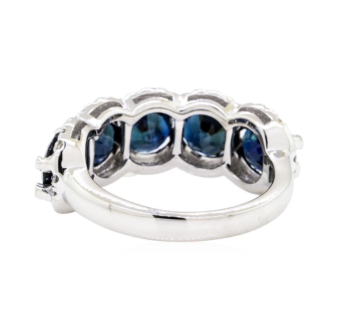 One electronically tested 14KT white gold lady's cast fashion five-stone ring with a semi-halo with a bright polish finish. The featured lady's ring has a shank measuring 2.77 millimeters wide. Identified with markings of '14K'. Condition is new, good workmanship. Containing: Five prong set round modified mixed cut natural blue sapphires, measuring 6.03 - 5.85 x 3.60 mm, (depth est.) approximate total weight of 5.16ct., clarity is slightly included, dark, moderately strong, very slightly greenish blue color, (GIA vslgB 7/4), cut is very good. Transmitting light with a minimum of distortion, transparent. Colored gemstones are presumed to have been subjected to commonly used enhancement processes. Graded in the setting. Forty-Eight prong set round brilliant cut diamonds, measuring 1.50 - 1.40 x 0.90mm (depth est.) approximate total weight of 48 Stones = 0.55ct. Graded in the setting. Color G - H Clarity VS-1 to VS-2 Cut Very Good. Total Weight of Colored Stones 5.16ct.. Total Weight of Diamonds 0.55ct.. Total Weight of Ring 5.80gm. GAS Appraised.