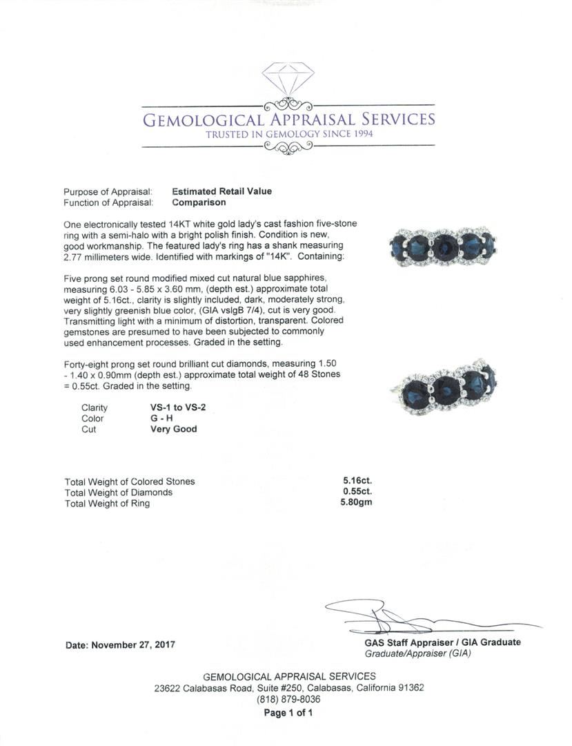 One electronically tested 14KT white gold lady's cast fashion five-stone ring with a semi-halo with a bright polish finish. The featured lady's ring has a shank measuring 2.77 millimeters wide. Identified with markings of '14K'. Condition is new, good workmanship. Containing: Five prong set round modified mixed cut natural blue sapphires, measuring 6.03 - 5.85 x 3.60 mm, (depth est.) approximate total weight of 5.16ct., clarity is slightly included, dark, moderately strong, very slightly greenish blue color, (GIA vslgB 7/4), cut is very good. Transmitting light with a minimum of distortion, transparent. Colored gemstones are presumed to have been subjected to commonly used enhancement processes. Graded in the setting. Forty-Eight prong set round brilliant cut diamonds, measuring 1.50 - 1.40 x 0.90mm (depth est.) approximate total weight of 48 Stones = 0.55ct. Graded in the setting. Color G - H Clarity VS-1 to VS-2 Cut Very Good. Total Weight of Colored Stones 5.16ct.. Total Weight of Diamonds 0.55ct.. Total Weight of Ring 5.80gm. GAS Appraised.
