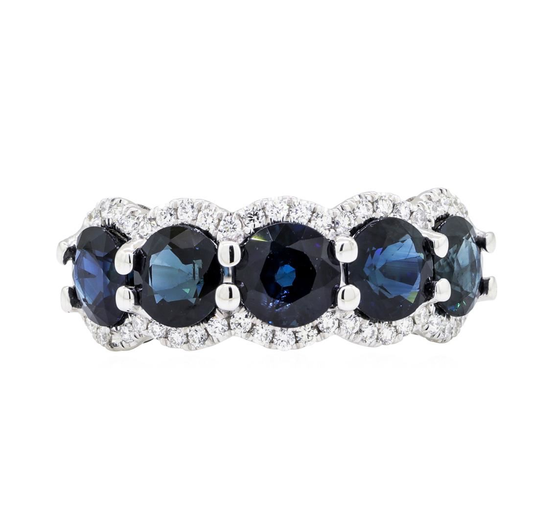 One electronically tested 14KT white gold lady's cast fashion five-stone ring with a semi-halo with a bright polish finish. The featured lady's ring has a shank measuring 2.77 millimeters wide. Identified with markings of '14K'. Condition is new, good workmanship. Containing: Five prong set round modified mixed cut natural blue sapphires, measuring 6.03 - 5.85 x 3.60 mm, (depth est.) approximate total weight of 5.16ct., clarity is slightly included, dark, moderately strong, very slightly greenish blue color, (GIA vslgB 7/4), cut is very good. Transmitting light with a minimum of distortion, transparent. Colored gemstones are presumed to have been subjected to commonly used enhancement processes. Graded in the setting. Forty-Eight prong set round brilliant cut diamonds, measuring 1.50 - 1.40 x 0.90mm (depth est.) approximate total weight of 48 Stones = 0.55ct. Graded in the setting. Color G - H Clarity VS-1 to VS-2 Cut Very Good. Total Weight of Colored Stones 5.16ct.. Total Weight of Diamonds 0.55ct.. Total Weight of Ring 5.80gm. GAS Appraised.