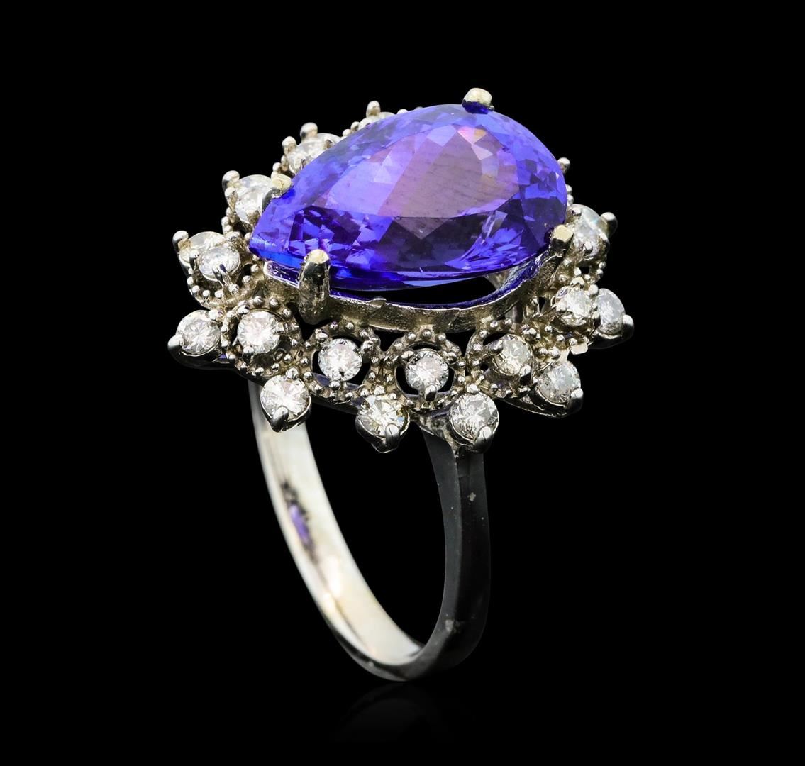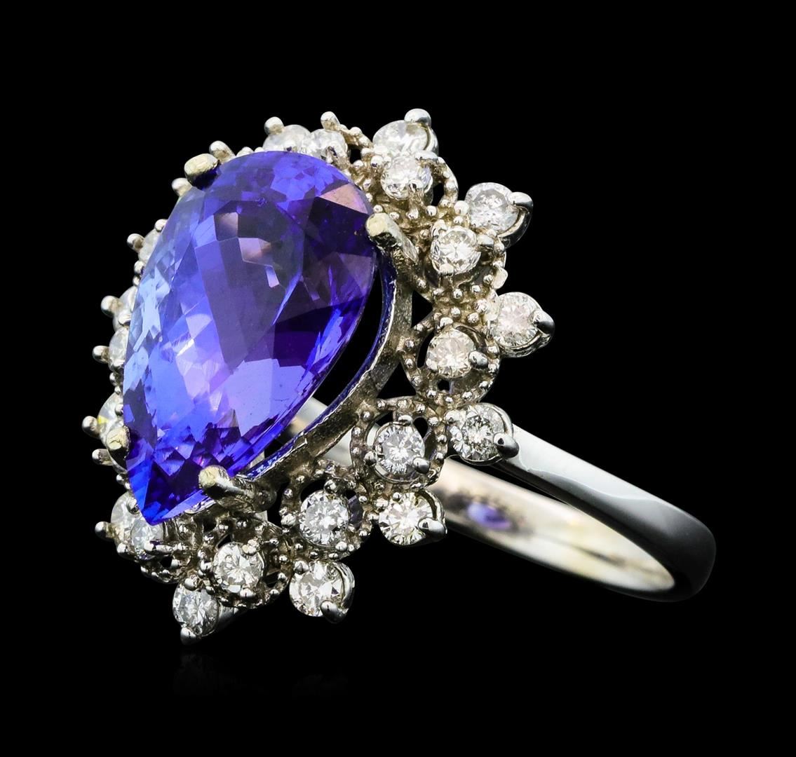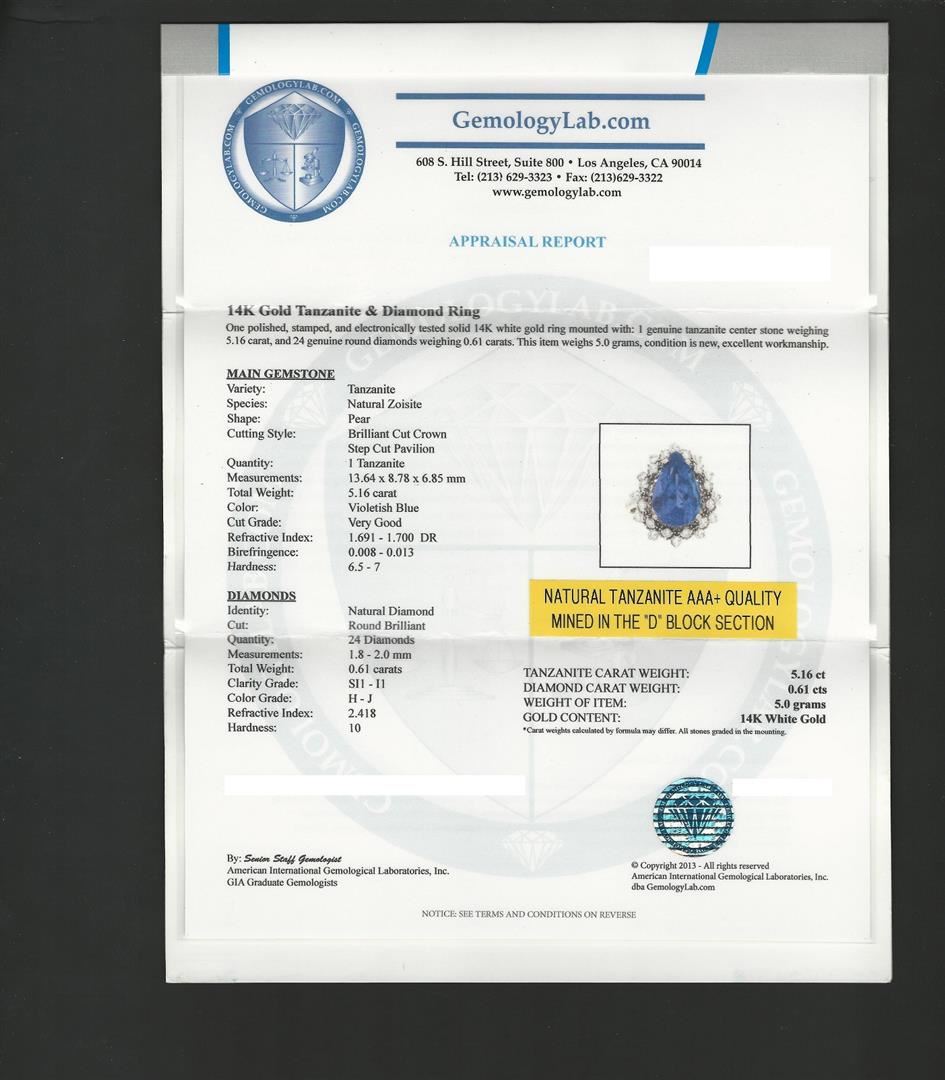 One polished, stamped, and electronically tested solid 14K white gold ring mounted with: 1 genuine tanzanite center weighing 5.16 carat, and 24 genuine round diamonds weighing 0.61 carats. This item weighs 5.0 grams, condition is new, excellent workmanship. AIGL Appraised.