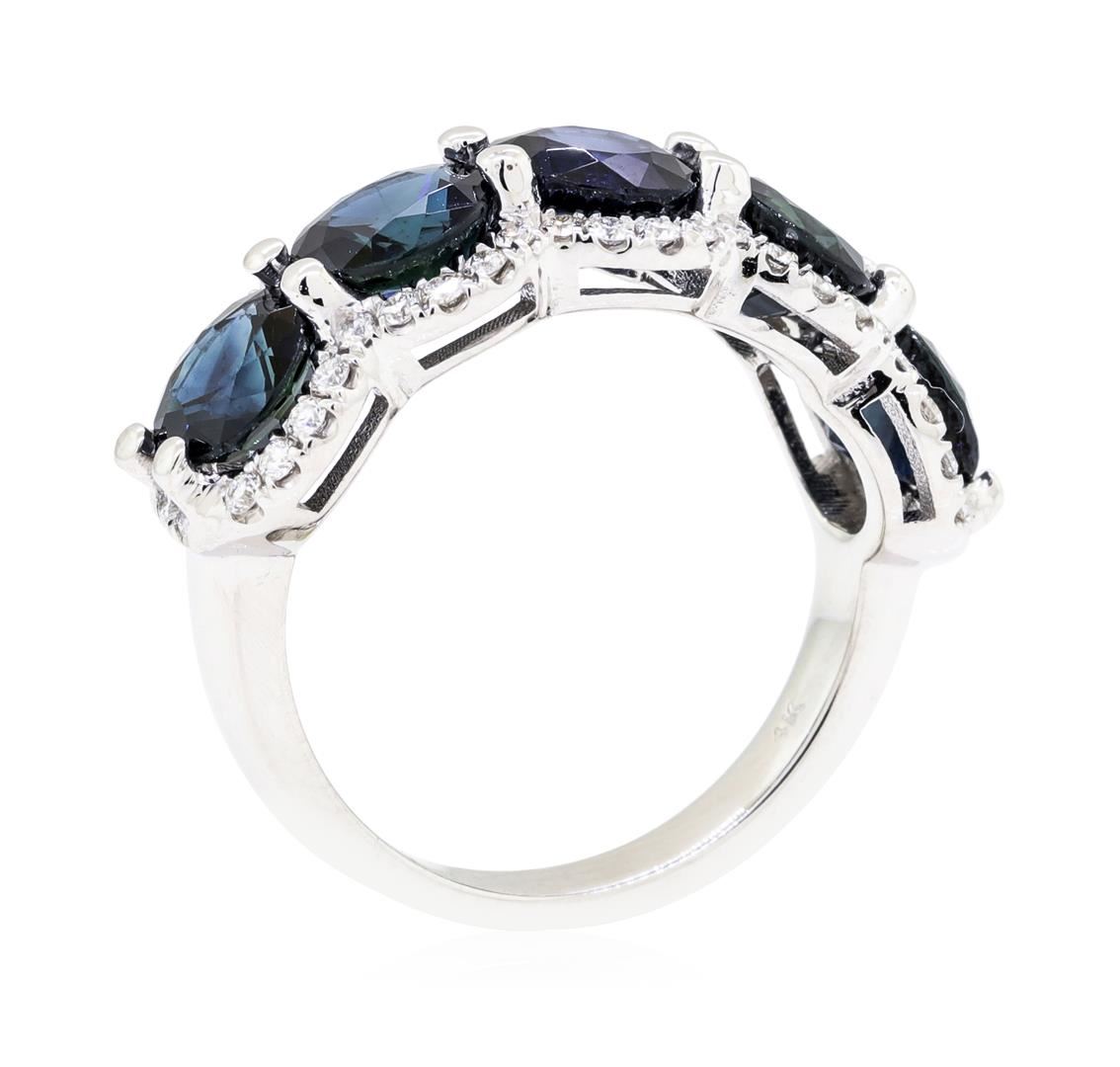 One electronically tested 14KT white gold lady's cast fashion five-stone ring with a semi-halo with a bright polish finish. The featured lady's ring has a shank measuring 2.77 millimeters wide. Identified with markings of '14K'. Condition is new, good workmanship. Containing: Five prong set round modified mixed cut natural blue sapphires, measuring 6.03 - 5.85 x 3.60 mm, (depth est.) approximate total weight of 5.16ct., clarity is slightly included, dark, moderately strong, very slightly greenish blue color, (GIA vslgB 7/4), cut is very good. Transmitting light with a minimum of distortion, transparent. Colored gemstones are presumed to have been subjected to commonly used enhancement processes. Graded in the setting. Forty-Eight prong set round brilliant cut diamonds, measuring 1.50 - 1.40 x 0.90mm (depth est.) approximate total weight of 48 Stones = 0.55ct. Graded in the setting. Color G - H Clarity VS-1 to VS-2 Cut Very Good. Total Weight of Colored Stones 5.16ct.. Total Weight of Diamonds 0.55ct.. Total Weight of Ring 5.80gm. GAS Appraised.