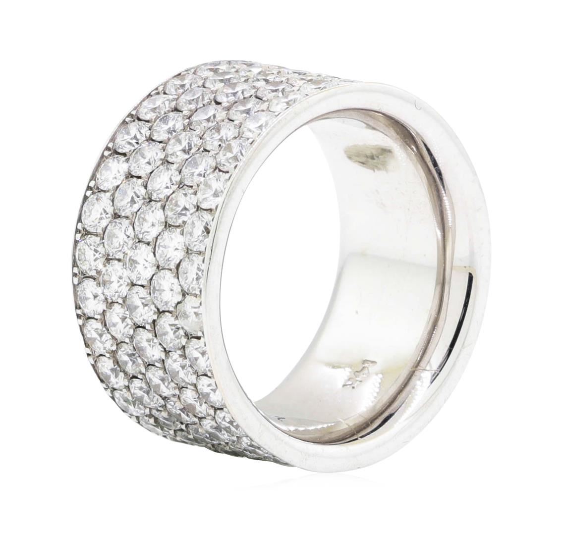 One electronically tested 14KT white gold Ladies cast fashion eternity ring with a five row wide band with a bright polish finish. The featured Ladies ring has a finger size of 6 and a shank measuring 10.9 millimeters wide. Identified with markings of '14K'. Condition is new, good workmanship. Containing: One Hundred Forty prong set round brilliant cut diamonds, measuring 2.20 - 2.10 x 1.33mm (depth est.) approximate total weight of 140 Stones = 5.25ct. Graded in the setting. Color H - I Clarity VS-2 to SI-2 Cut Very Good. Total Weight of Diamonds 5.25ct.. Total Weight of Eternity Ring 11.10gm. GAS Appraised.