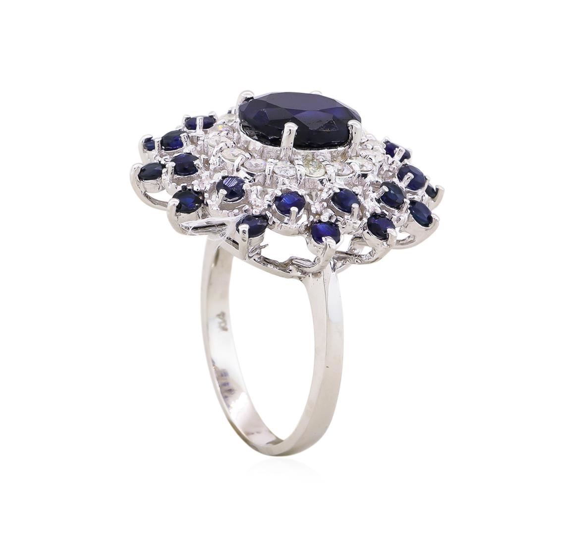 Fourteen Karat (14K) White Gold Sapphire And Diamond Ring. An Oval Cut Sapphire Corundum Gemstone Is Prong Mounted In The Center Of The Ring. Round Brilliant Cut Diamonds And Sapphire Corundum Gemstones Accent The Ring Around The Center Gemstone. The Ring Is Cast Stamped "14K" And Has A Gross Weight Of 7.4 Grams. Diamonds: Shape: Round Brilliant Cut, Weight: 0.49 Carat, Average Clarity: Il, Average Color: H-L, Symmetry: Very Good, Polish: Very Good. Gemstone: Sapphire Corundum. Shape: Oval And Round, Faceted, Quantity: 25, Mounted (1 Center And 24 Side Stones), Weight: 5.43 Carat Total, Center Stone Dimensions: Length-10.03 Mm.; Width-8.10 Mm., Bulge: Visible, Clarity: Si, Type 3, Color: Blue (5/5), Symmetry: Very Good, Color Intensity: Medium, Transparency: Transparent, Tone: Dark. Comments: Indications Of High Temperature And Diffusion. Metal: Gold, Stamped. Purity: 14K, Color: White, Condition: Excellent, Finish: High Polish. GGA Appraised at $4,760.00.