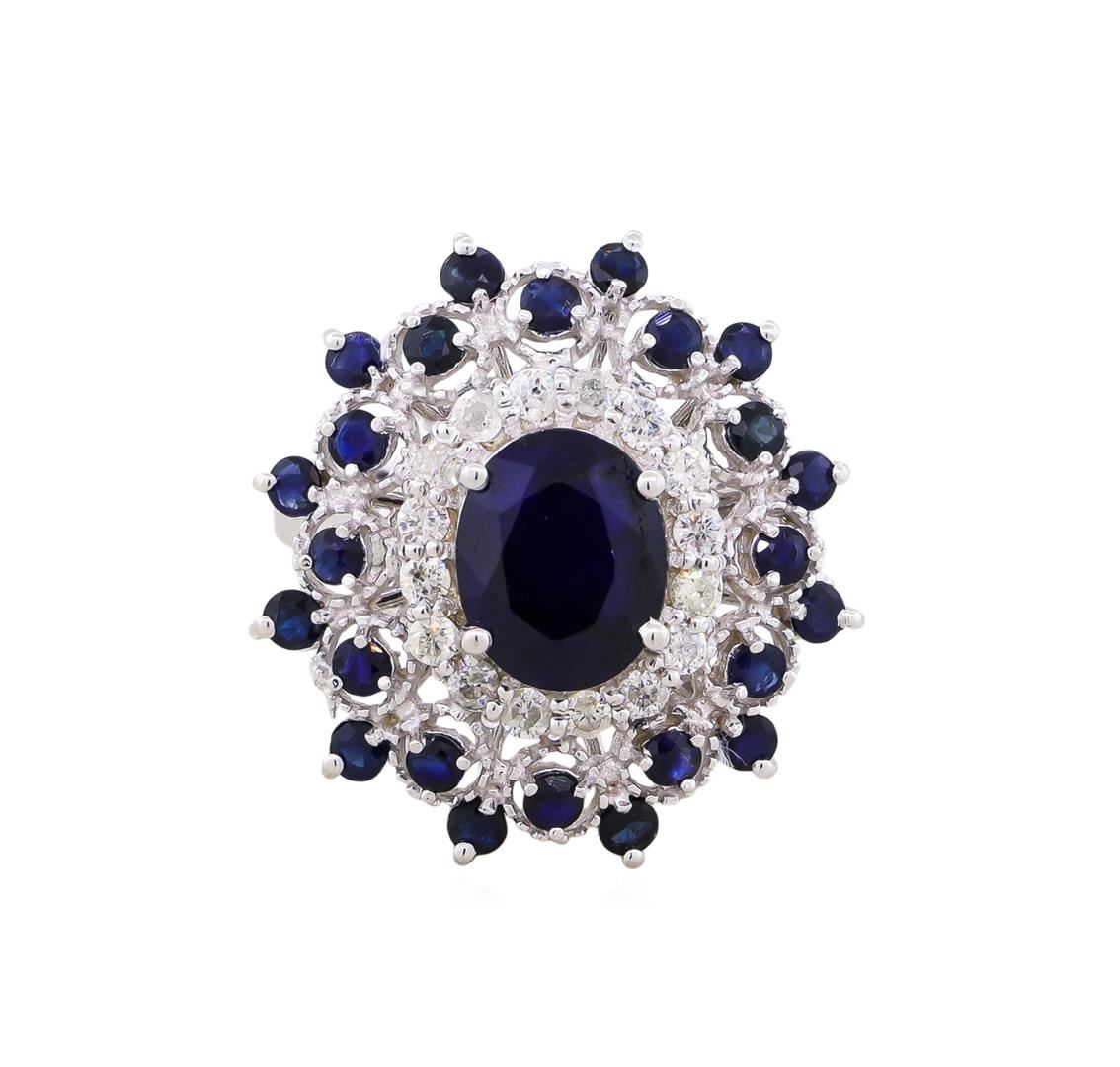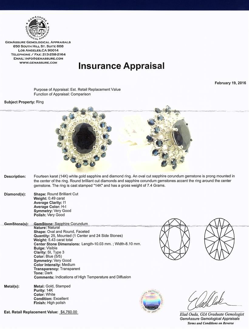 Fourteen Karat (14K) White Gold Sapphire And Diamond Ring. An Oval Cut Sapphire Corundum Gemstone Is Prong Mounted In The Center Of The Ring. Round Brilliant Cut Diamonds And Sapphire Corundum Gemstones Accent The Ring Around The Center Gemstone. The Ring Is Cast Stamped "14K" And Has A Gross Weight Of 7.4 Grams. Diamonds: Shape: Round Brilliant Cut, Weight: 0.49 Carat, Average Clarity: Il, Average Color: H-L, Symmetry: Very Good, Polish: Very Good. Gemstone: Sapphire Corundum. Shape: Oval And Round, Faceted, Quantity: 25, Mounted (1 Center And 24 Side Stones), Weight: 5.43 Carat Total, Center Stone Dimensions: Length-10.03 Mm.; Width-8.10 Mm., Bulge: Visible, Clarity: Si, Type 3, Color: Blue (5/5), Symmetry: Very Good, Color Intensity: Medium, Transparency: Transparent, Tone: Dark. Comments: Indications Of High Temperature And Diffusion. Metal: Gold, Stamped. Purity: 14K, Color: White, Condition: Excellent, Finish: High Polish. GGA Appraised at $4,760.00.