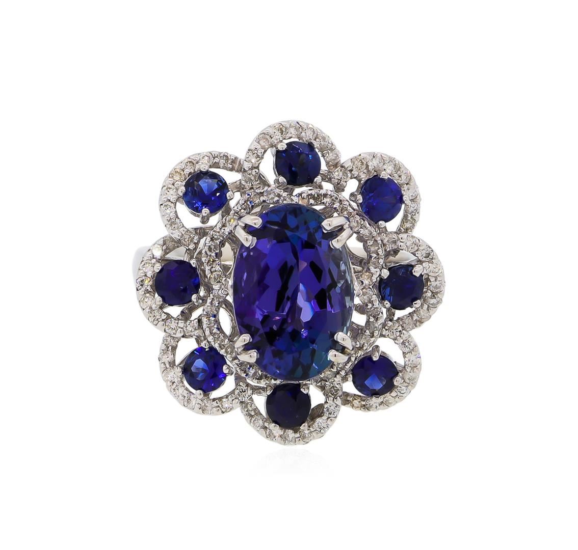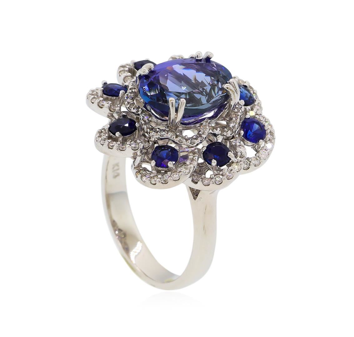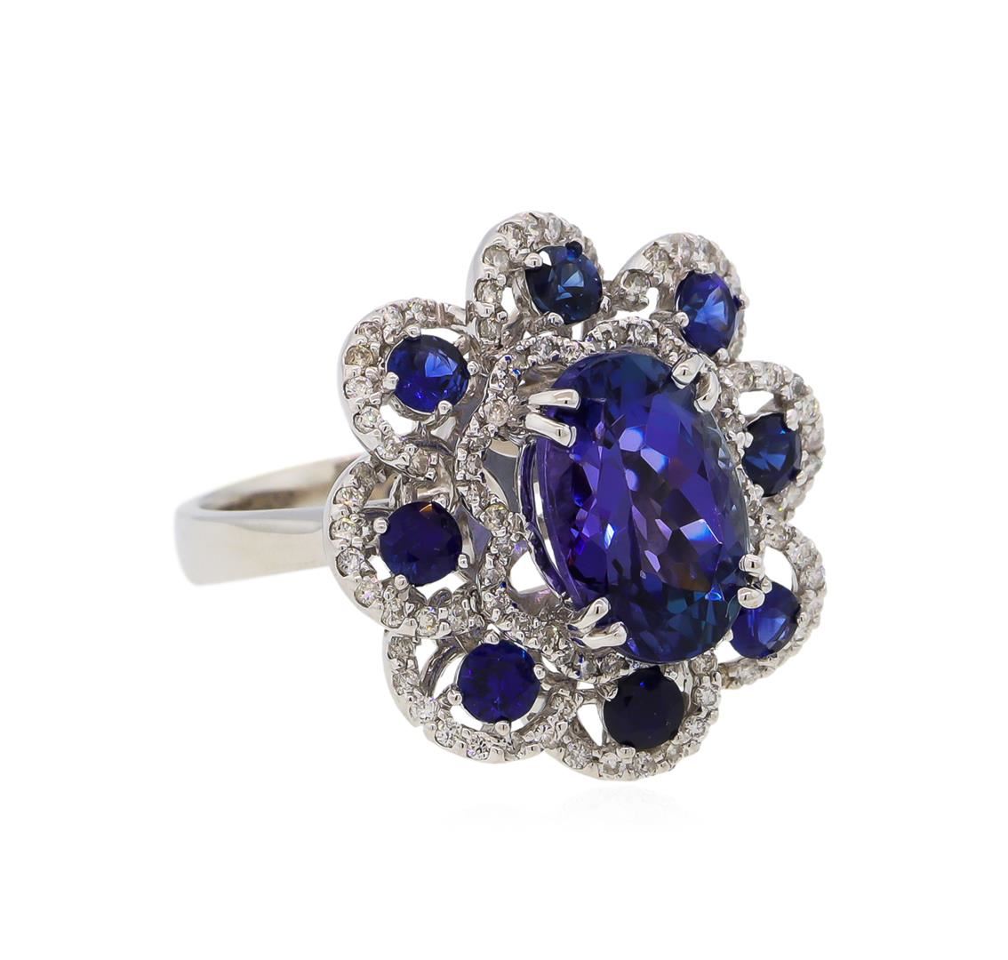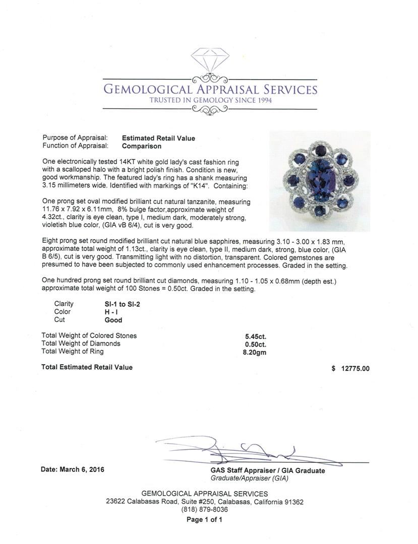 One electronically tested 14KT white gold lady's cast fashion ring with a scalloped halo with a bright polish finish. The featured lady's ring has a shank measuring 3.15 millimeters wide. Identified with markings of "K14". Condition is new, good workmanship. Containing: One prong set oval modified brilliant cut natural tanzanite, measuring 11.76 x 7.92 x 6.11mm, 8%. bulge factor, approximate weight of 4.32ct., clarity is eye clean, type I, medium dark, moderately strong, violetish blue color, (GIA vB 6/4), cut is very good. Eight prong set round modified brilliant cut natural blue sapphires, measuring 3.10 - 3.00 x 1.83 mm, approximate total Weight of 1.13ct., clarity is eye clean, type II, medium dark, strong, blue color, (GIA B 6/5), cut is very good. Transmitting light with no distortion, transparent. Colored gemstones are presumed to have been subjected to commonly used enhancement processes. Graded in the setting. One Hundred prong set round brilliant cut diamonds, measuring 1.10 - 1.05 x 0.68mm (depth est.) approximate total Weight of 100 Stones = 0.50ct. Graded in the setting. Clarity: SI-1 to SI-2. Color: H - I, Cut Good. Total Weight of Colored Stones 5.45ct. Total Weight of Diamonds 0.50ct. Total Weight of Ring 8.20gm. GAS Appraised at $12,775.00.