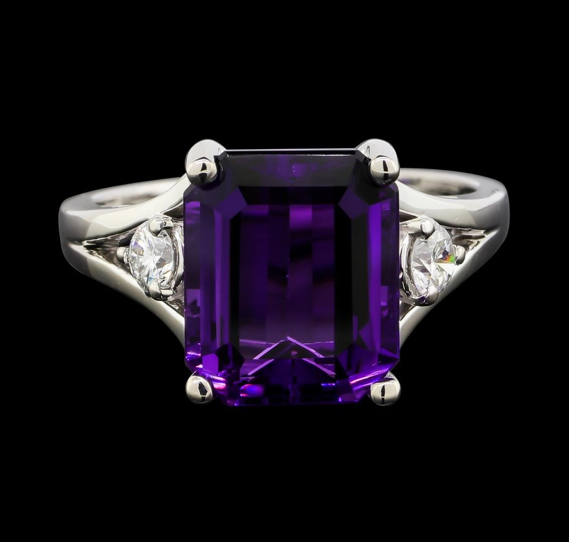 One electronically tested 14KT white gold lady's cast fashion ring with a split cathedral shank with a bright polish finish. The featured lady's ring has a shank measuring 1.83 millimeters wide. Condition is new, good workmanship. Containing: One prong set emerald standard step cut natural amethyst, measuring 12.15 x 10.15 x 6.17mm, (depth est.) approximate weight of 5.46ct., clarity is eye clean, medium dark, moderately strong, purple color, (GIA P 6/4), cut is very good. Two prong set round brilliant cut diamonds, measuring 3.50 - 3.40 x 2.07mm (depth est.) approximate total weight of 2 Stones = 0.30ct. Graded in the setting. Clarity: SI-1 to SI-2. Color: G - HCut Very Good. Total Weight of Colored Stones 5.46ct. Total Weight of Diamonds 0.30ct. Total Weight of Ring 6.10gm. GAS Appraised.